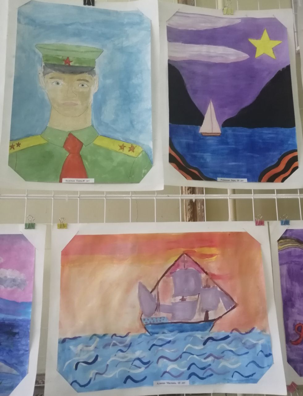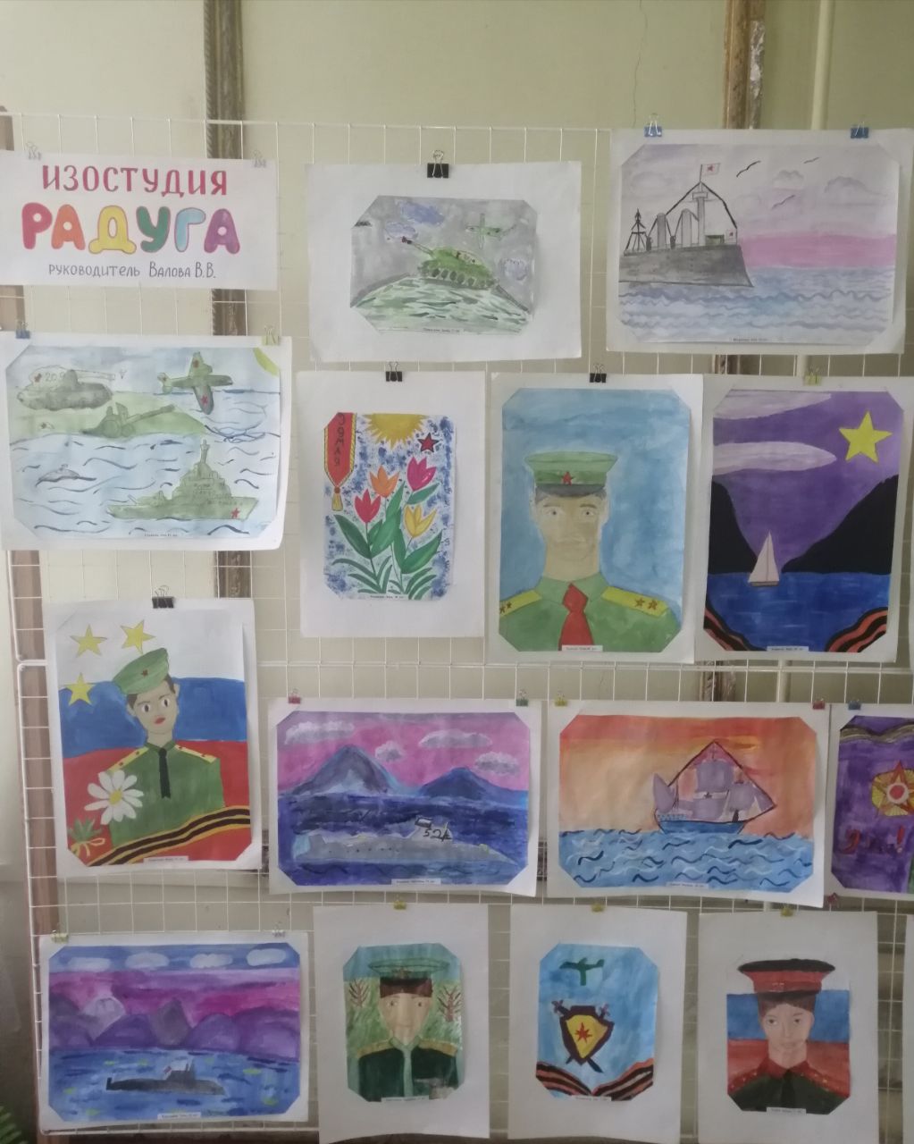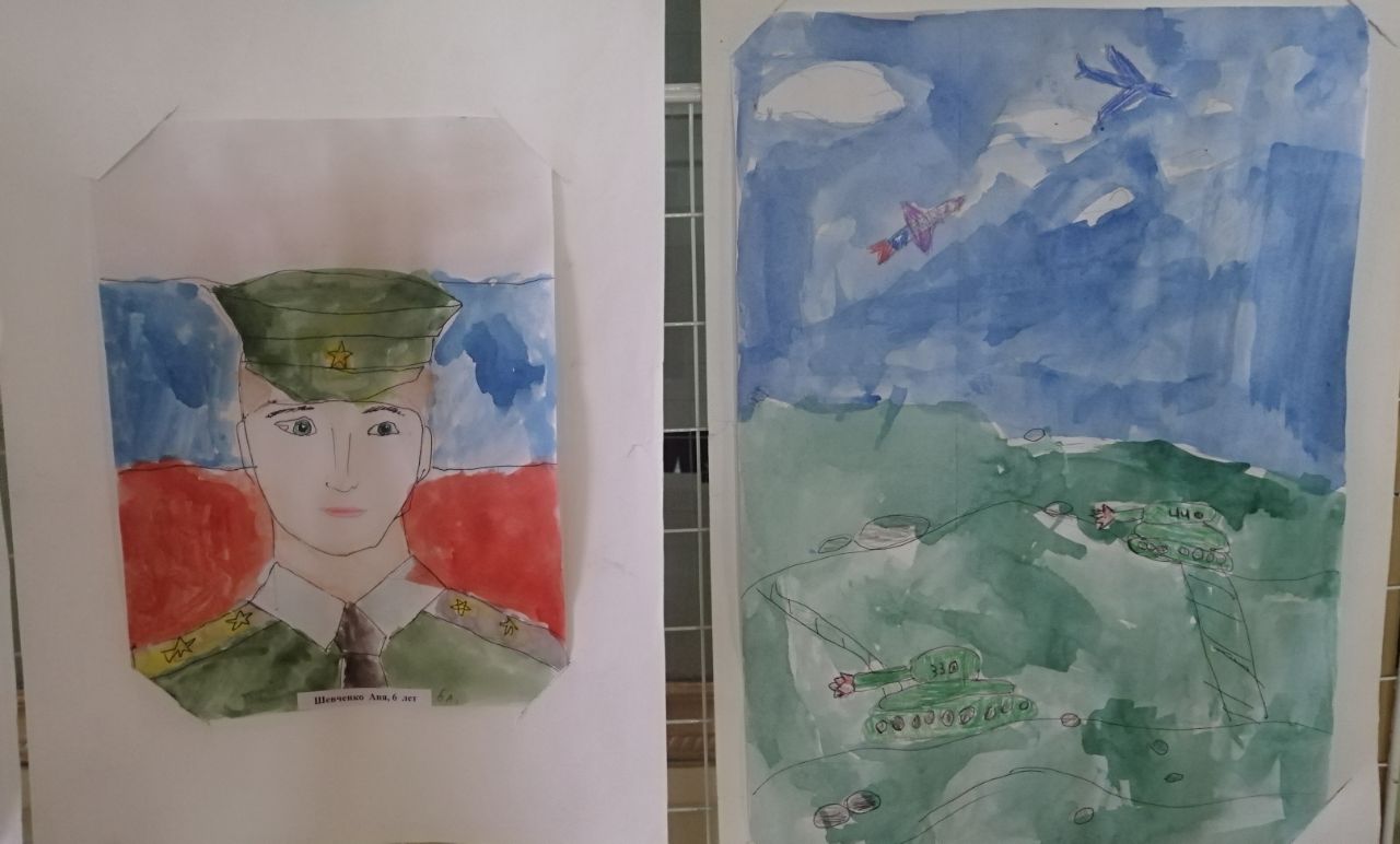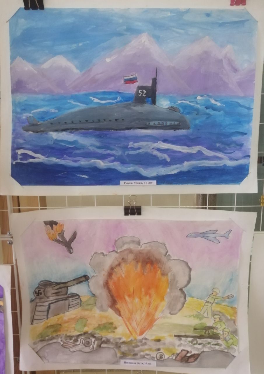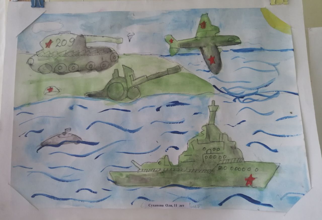 В своих рисунках дети изобразили портреты солдат, военную технику: подводные лодки и корабли, танки и самолёты, десантные войска.