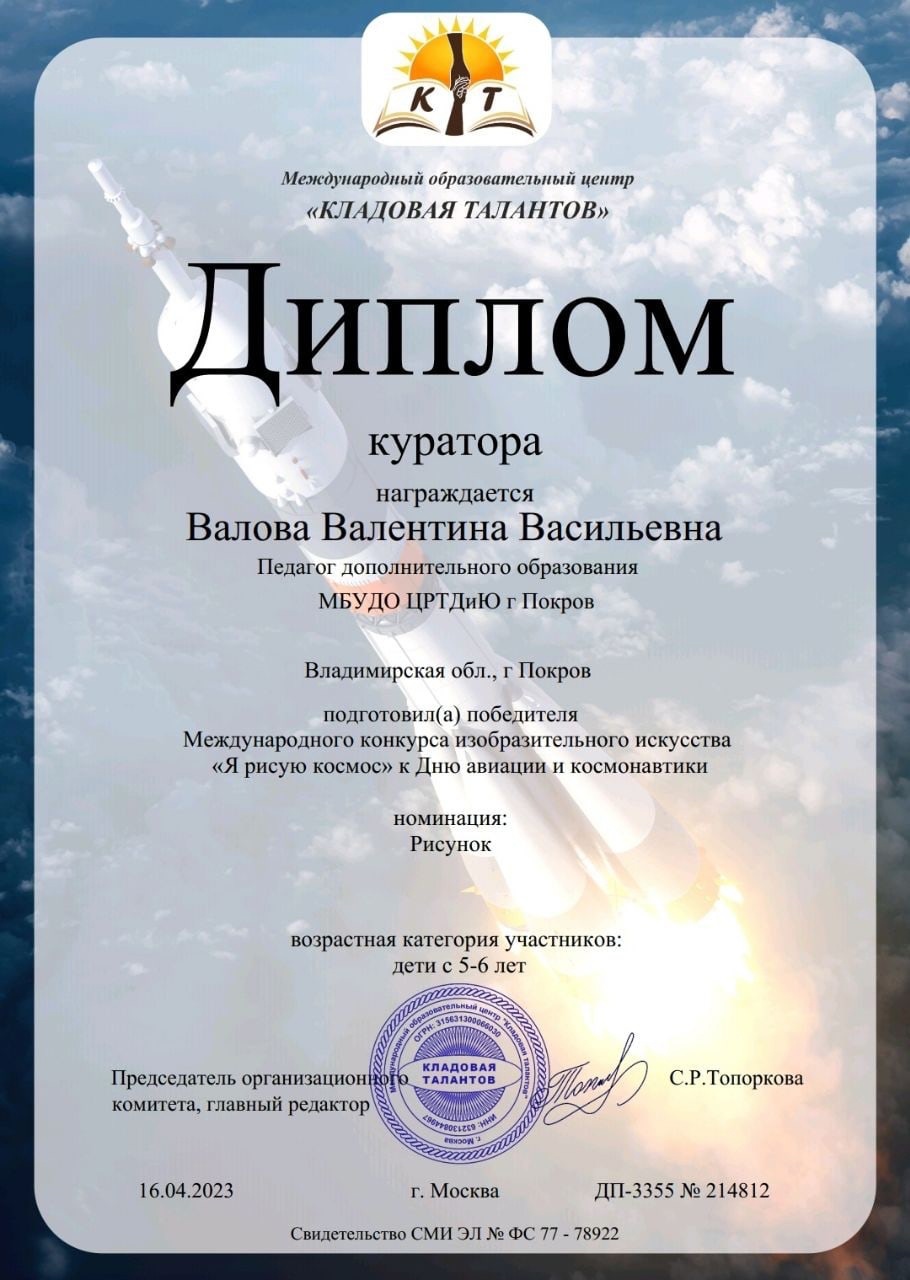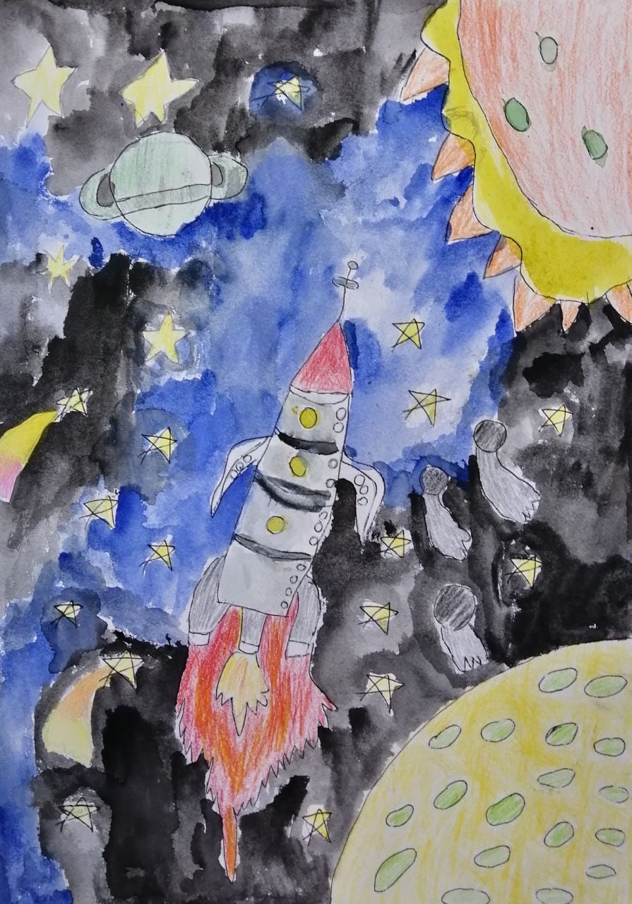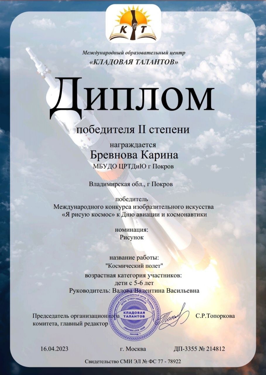 Поздравляем Бревнову Карину, обучающуюся изостудии "Акварелька" (руководитель Валова Валентина Васильевна) с победой в Международном конкурсе изобразительного искусства "Я рисую космос", посвящённого Дню авиации и космонавтики.