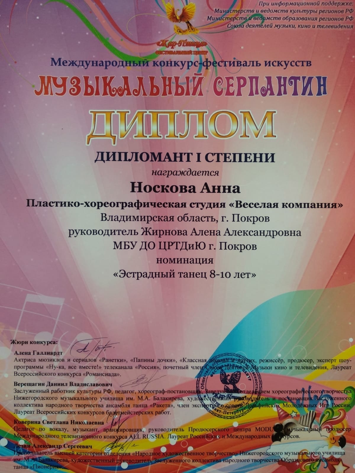 Солистка Пластико-хореографической студии " Весëлая компания " - Носкова Анна стала Дипломантом 1 степени, исполнив номер "Становлюсь ещё смелей"!
