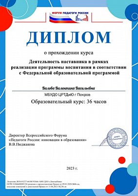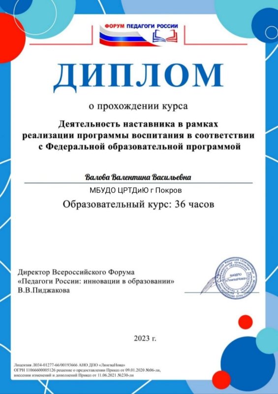 По окончании марафона педагог Валова Валентина Васильевна получила Диплом о прохождении курса повышения квалификации "Деятельность наставника в рамках реализации программы воспитания в соответствии с Федеральной образовательной программой"