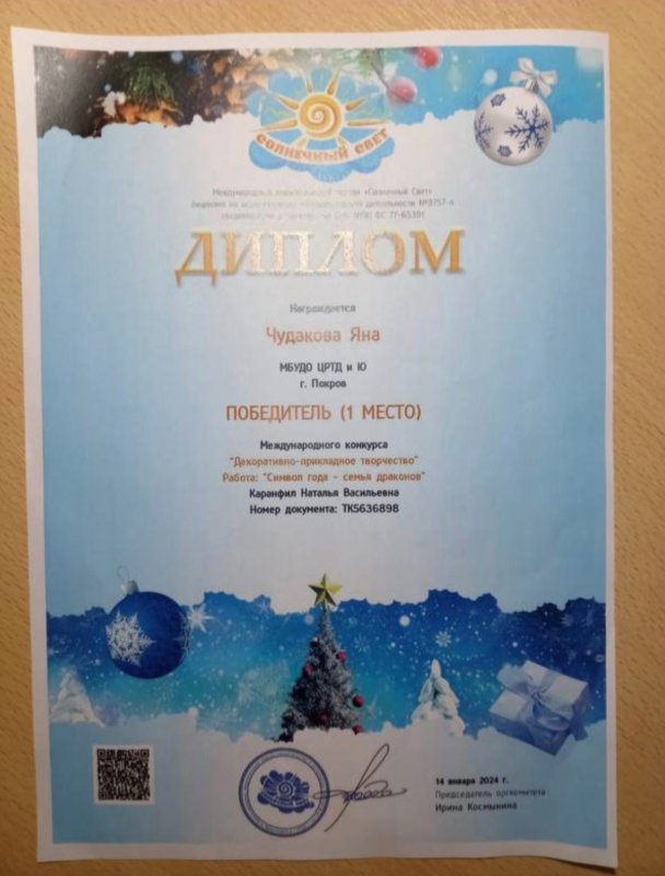 Чудакова Яна из студии «Бисероплетение»принимала участие в Международном конкурсе «Декоративно-прикладное творчество». Работа из бисера «Символ года-семья драконов» заняла 1 место!
