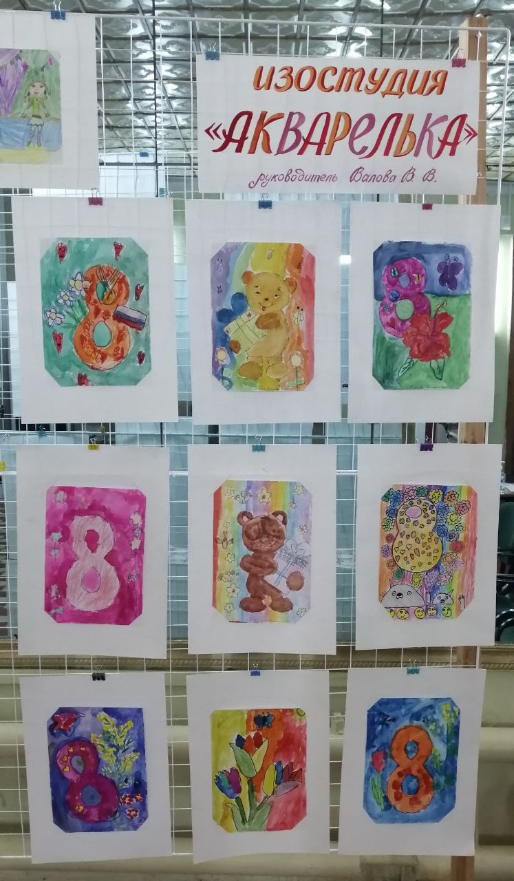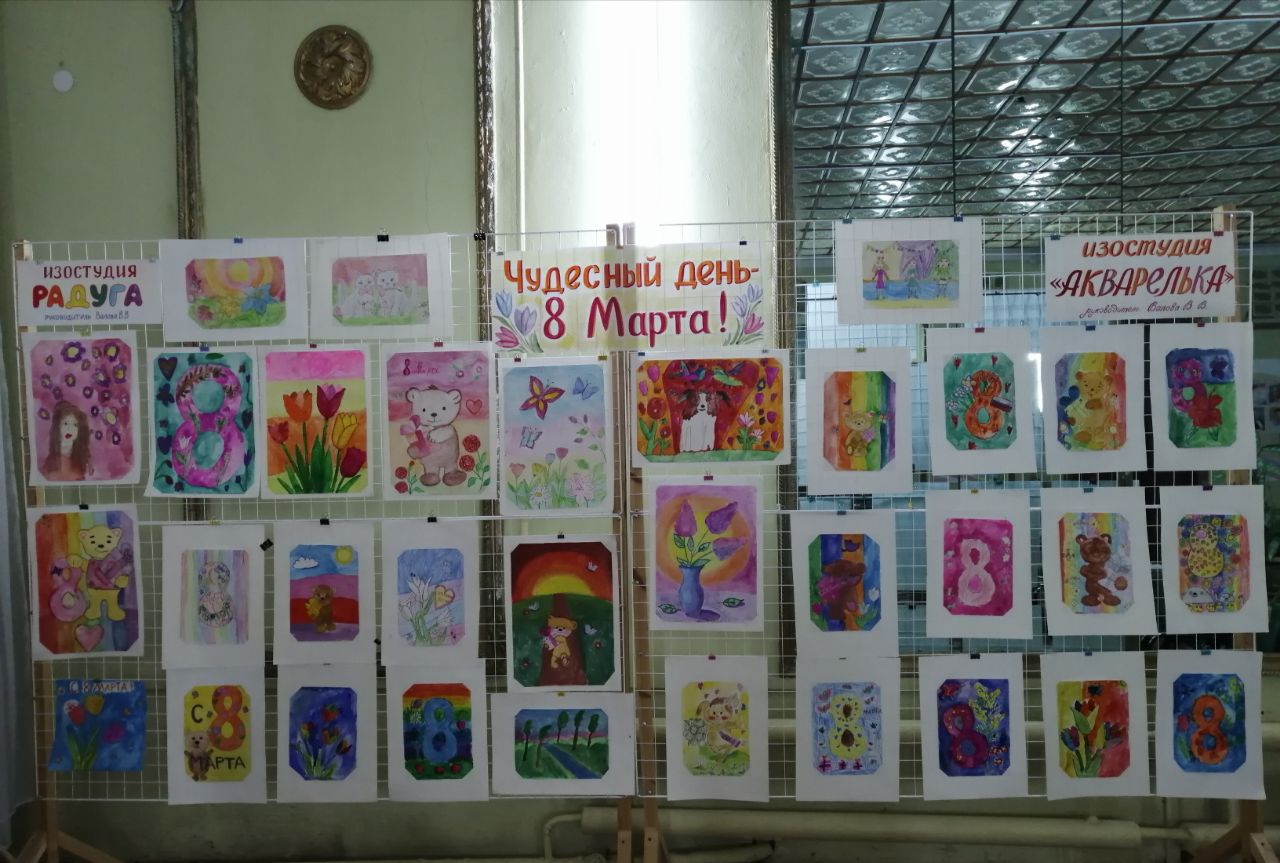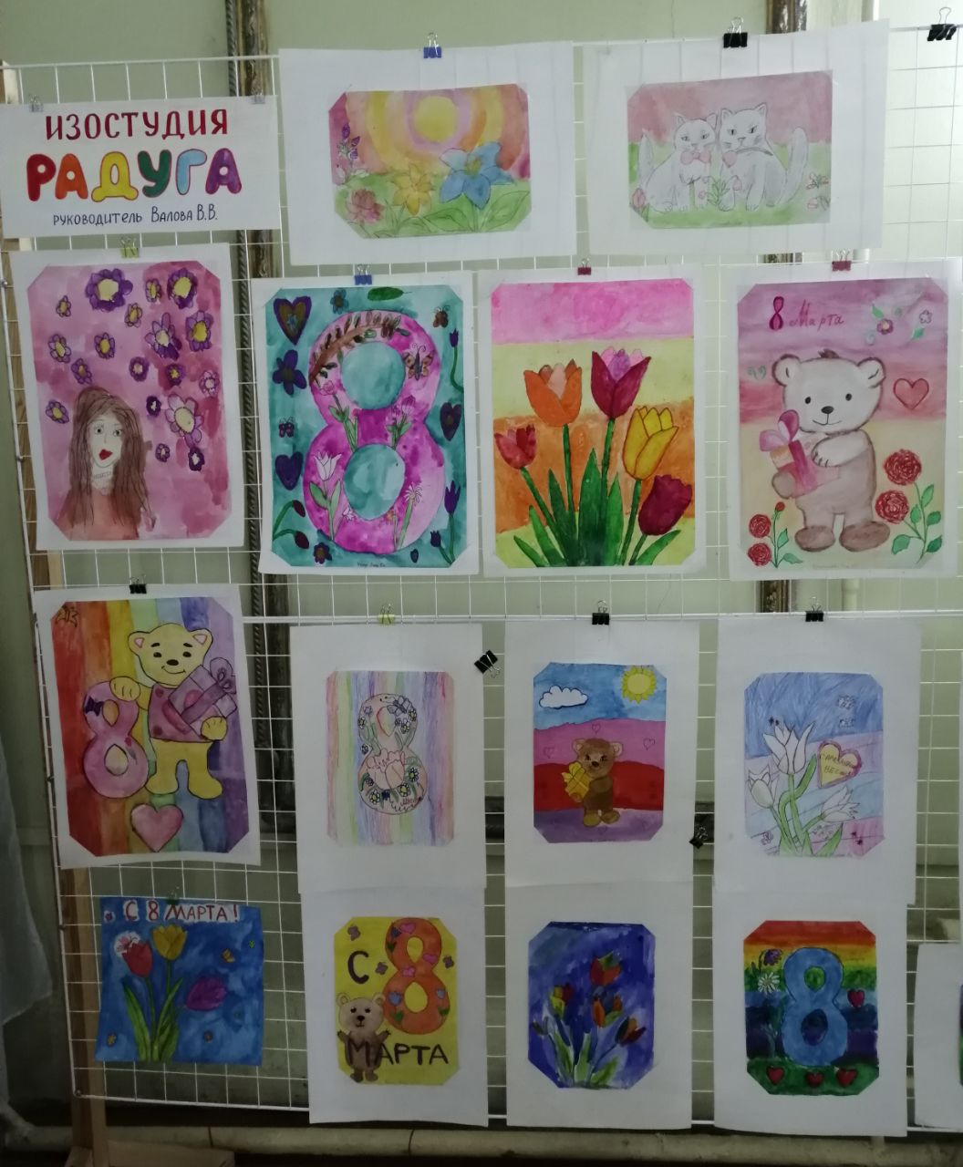 В Центре творчества открылась выставка работ "Чудесный день - 8 Марта!", которую выполнили обучающиеся изостудии "Радуга" и "Акварелька" (руководитель Валова Валентина Васильевна). На выставке представлены 33 работы.