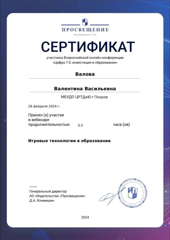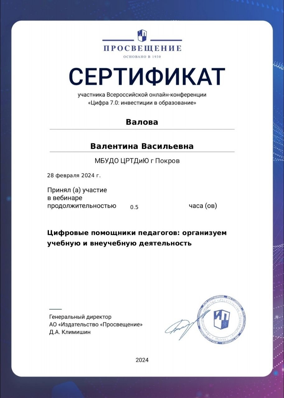 28 февраля 2024 года в рамках Всероссийской онлайн-конференции "Цифра 7.0: инвестиции в образовании", организованной издательством "Просвещение", руководитель изостудии "Радуга" Валова Валентина Васильевна принимала участие в вебинарах: