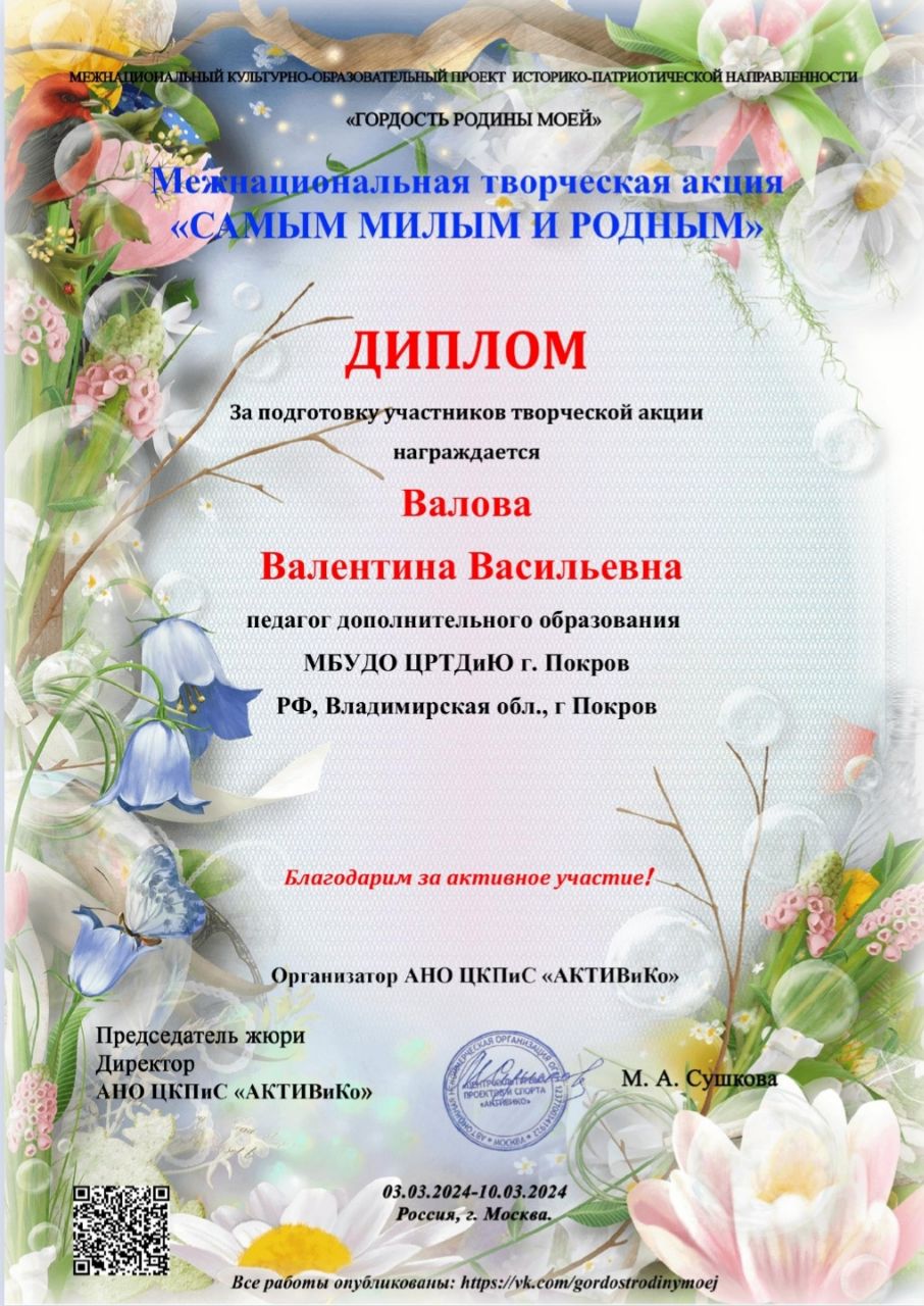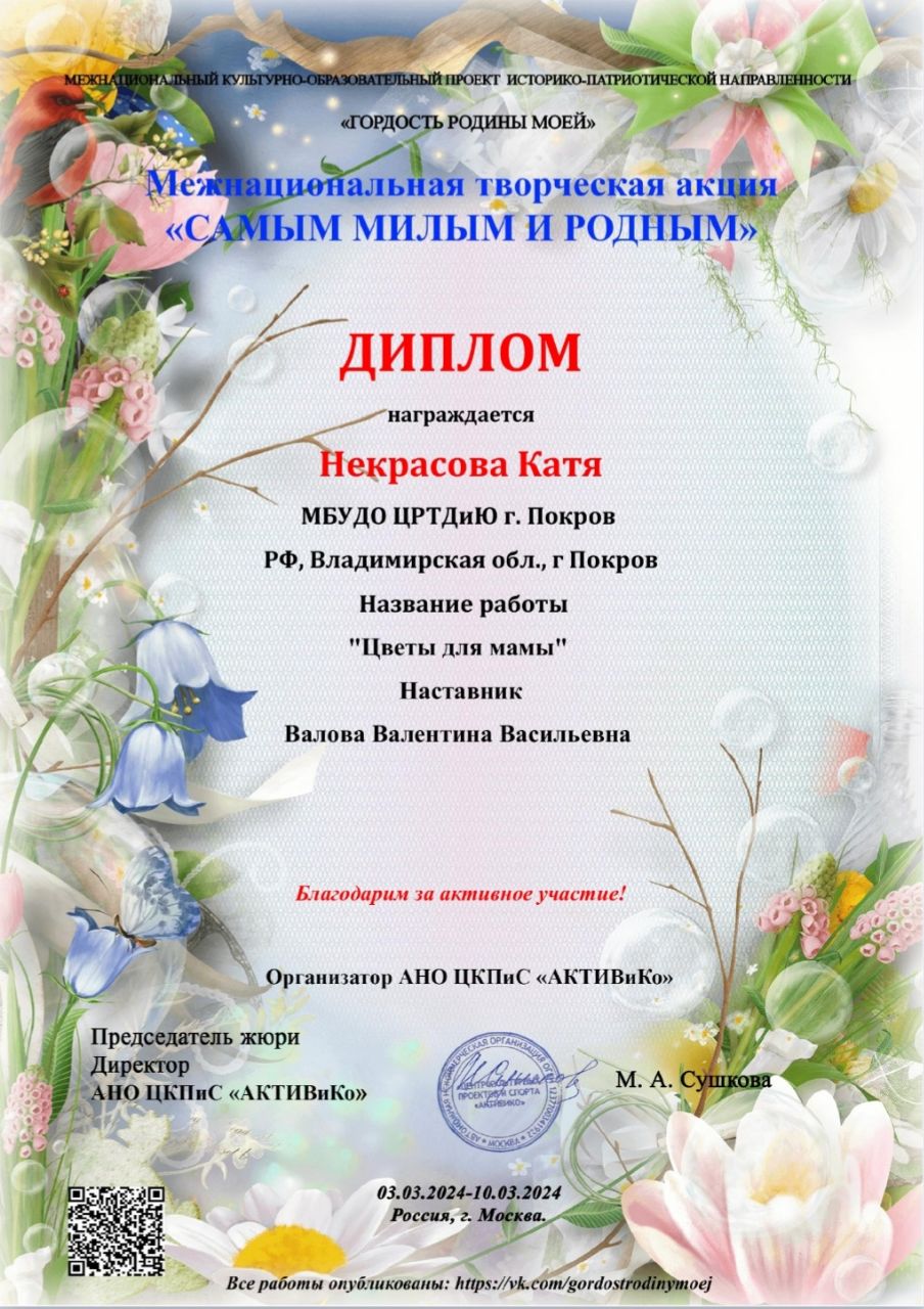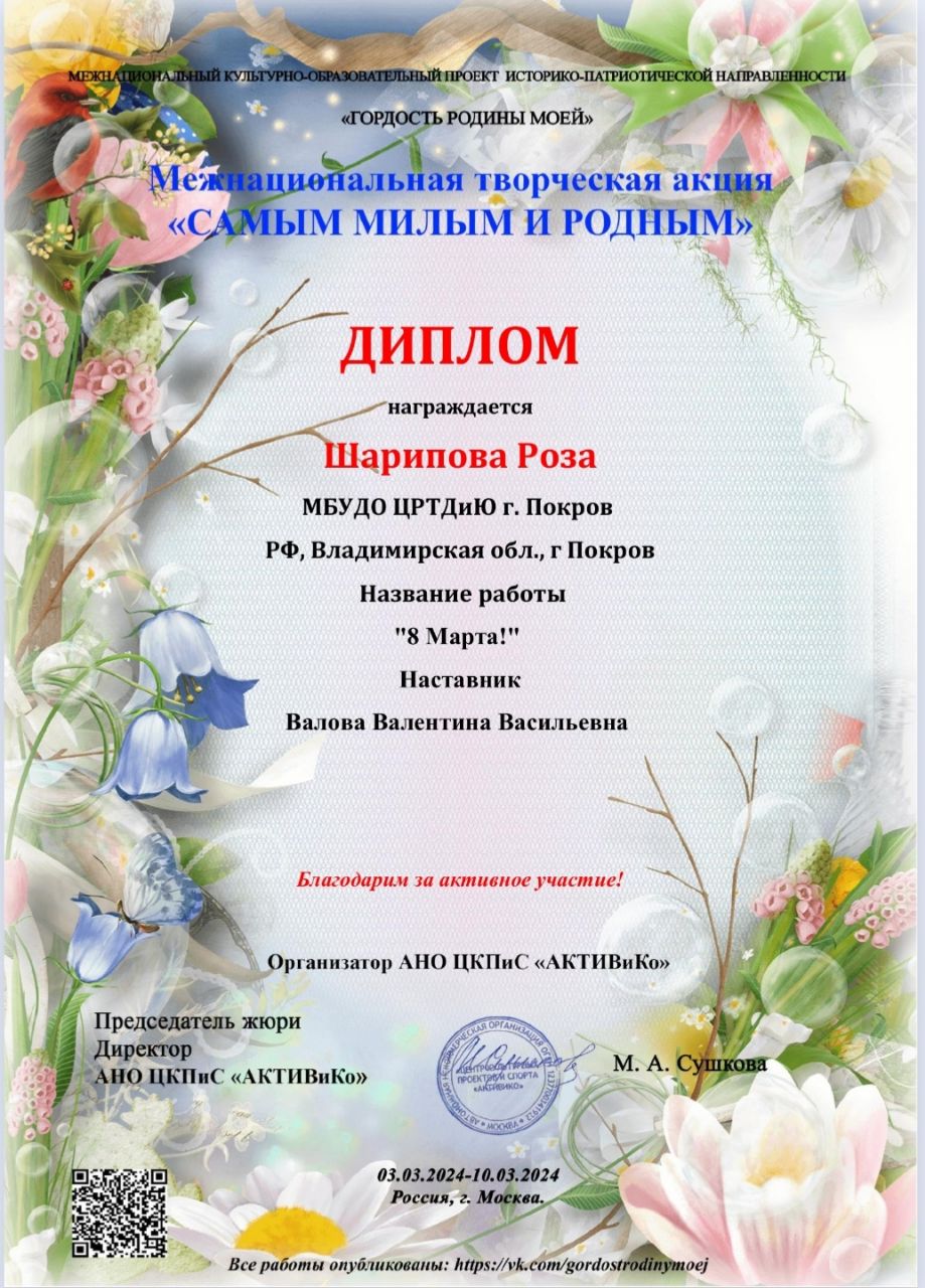 Поздравляем Первухину Вику, Шарипову Розу и Некрасову Катю - учащихся изостудии "Радуга" (руководитель Валова Валентина Васильевна), награжденных дипломами за участие в Межнациональной творческой акции "САМЫМ МИЛЫМ И РОДНЫМ".