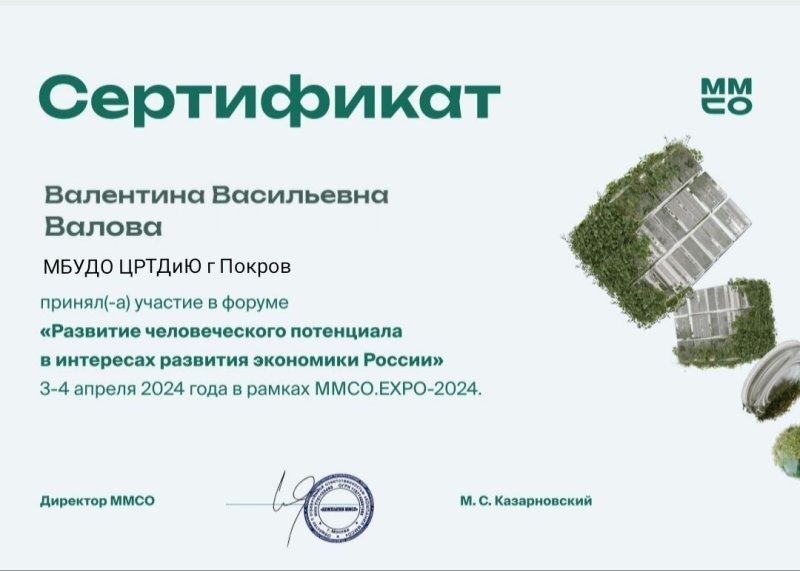 3-4 апреля 2024 года руководитель изостудии "Радуга" Валова Валентина Васильевна принимала участие в форуме "Развитие человеческого потенциала в интересах развития экономики России" в рамках MMCO. EXPO - 2024 г. Москва.