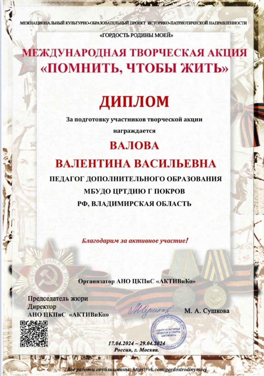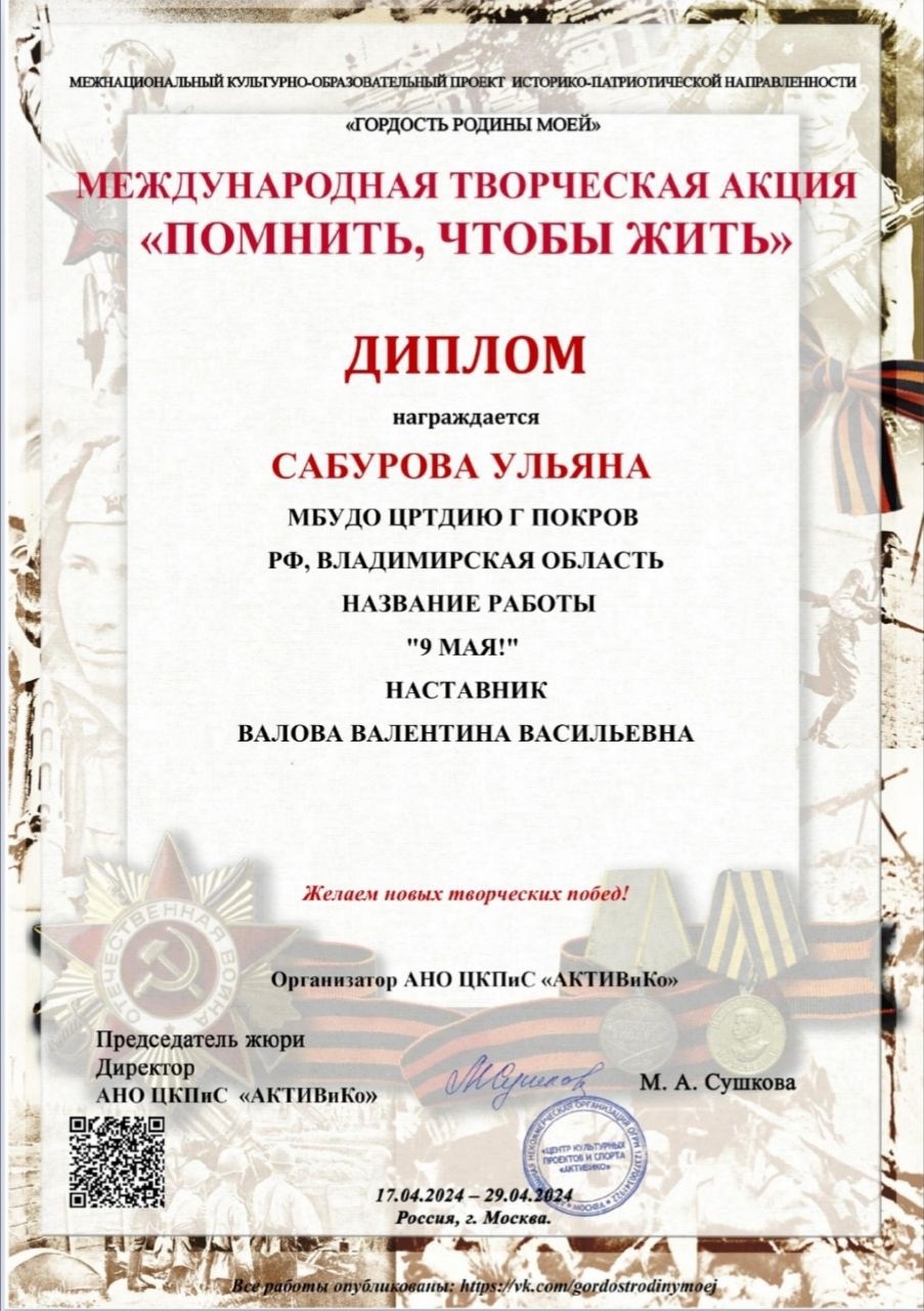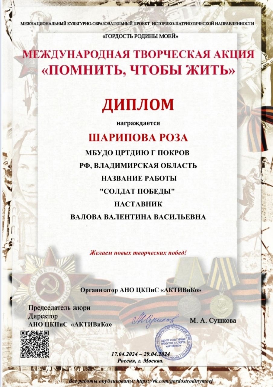 Поздравляем Первухину Вику, Шарипову Розу и Сабурову Ульяну - учащихся изостудии "Радуга" ???? (руководитель Валова Валентина Васильевна), награжденных дипломами за участие в Межнациональной творческой акции "ПОМНИМ, ЧТОБЫ ЖИТЬ", посвящённую Дню Победы.