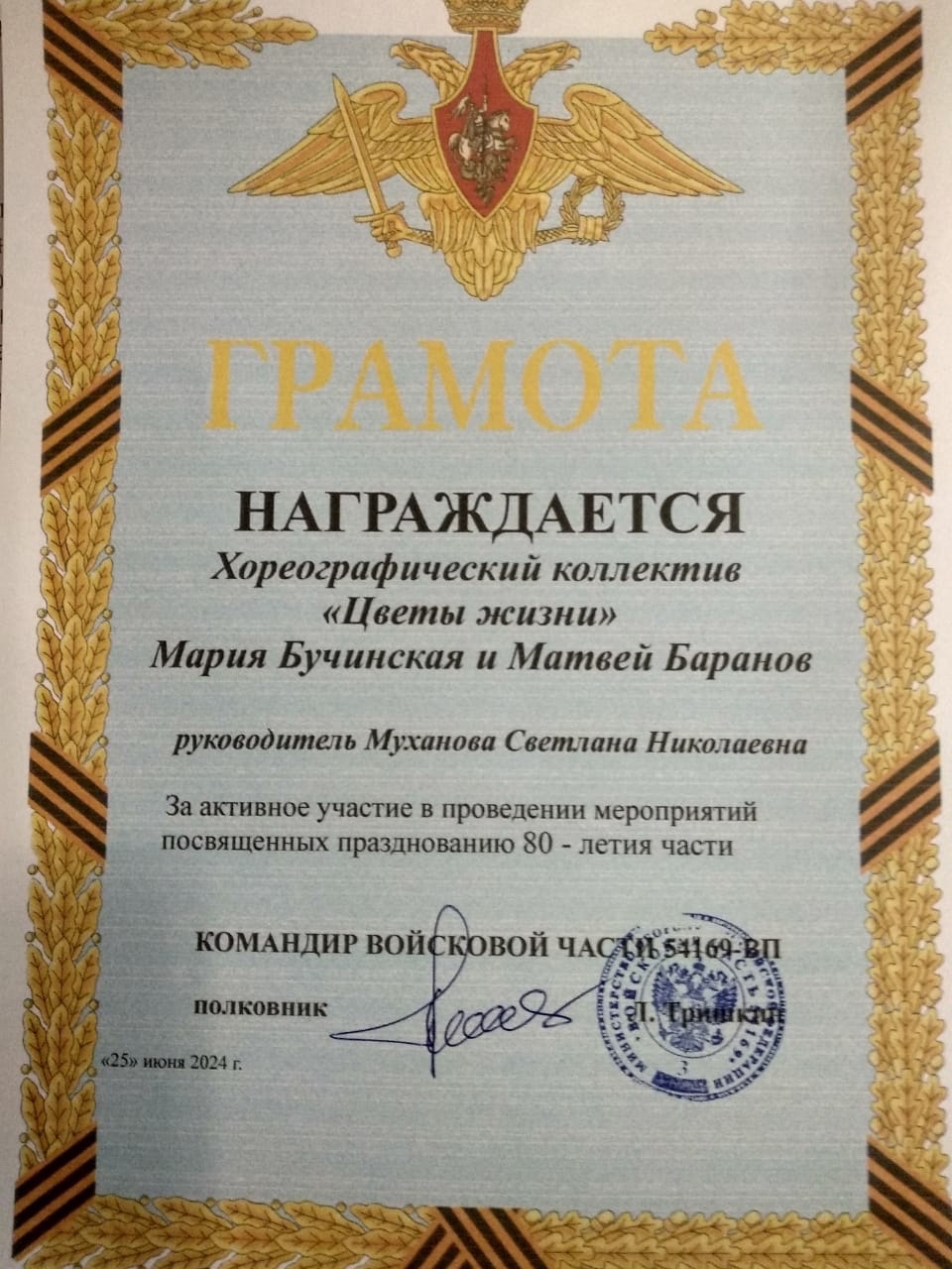 25 июня солисты Детского хореографического коллектива " Цветы жизни" Мария Бучинская и Егор Баранов приняли участие в праздничном концерте ,посвященном 82- летию Военной части п.Городищи.????