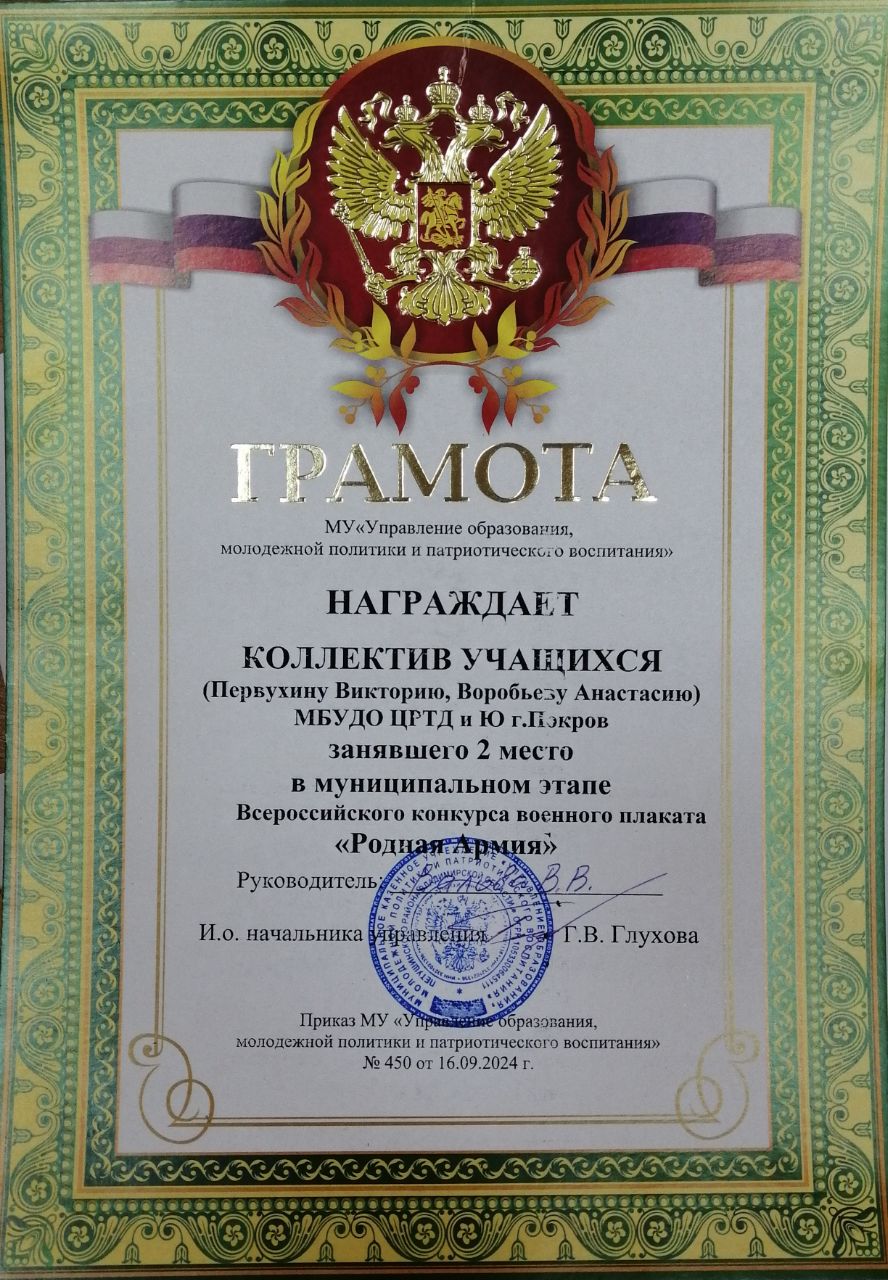 В конце сентября проводился Муниципальный этап Всероссийского конкурса военного плаката "Родная Армия", в котором принимали участие обучающиеся изостудии "Радуга" (руководитель Валова Валентина Васильевна). Поздравляем Первухину Вику и Воробьёву Настю, они заняли 2 место в номинации "Коллективная работа", возрастная категория 9-13 лет. И Торосян Шогик, занявшую 3 место в возрастной категории 9-13 лет. Очень рады за наших детей и желаем им творческих успехов и новых побед!