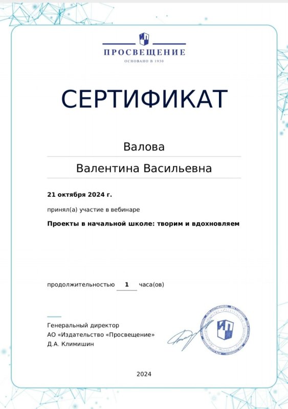 21 октября 2024 года руководитель изостудии "Радуга" Валова Валентина Васильевна принимала участие в вебинаре, организованном издательством Академия "Просвещение" г. Москва. Тема вебинара: "Проекты в начальной школе: творим и вдохновляем".