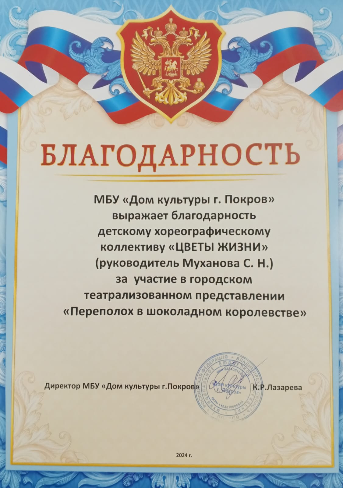На сцене концертного зала города 15 ноября состоялось выступление детей 2 -го года обучения Детского хореографического коллектива " Цветы жизни " . Ученики педагога допобразования Светланы Николаевны Мухановой стали участниками Театрализованной программы " Переполох в Шоколадном королевстве ".