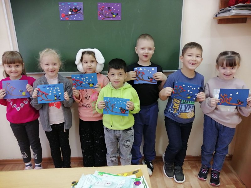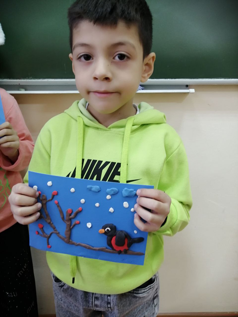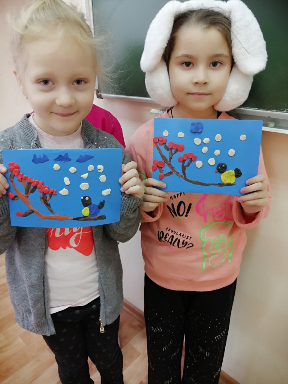 Ребята студии "Росток" с педагогом Зайцевой Марией Владимировной провели выставку работ пластилинографии "Снегири прилетели".