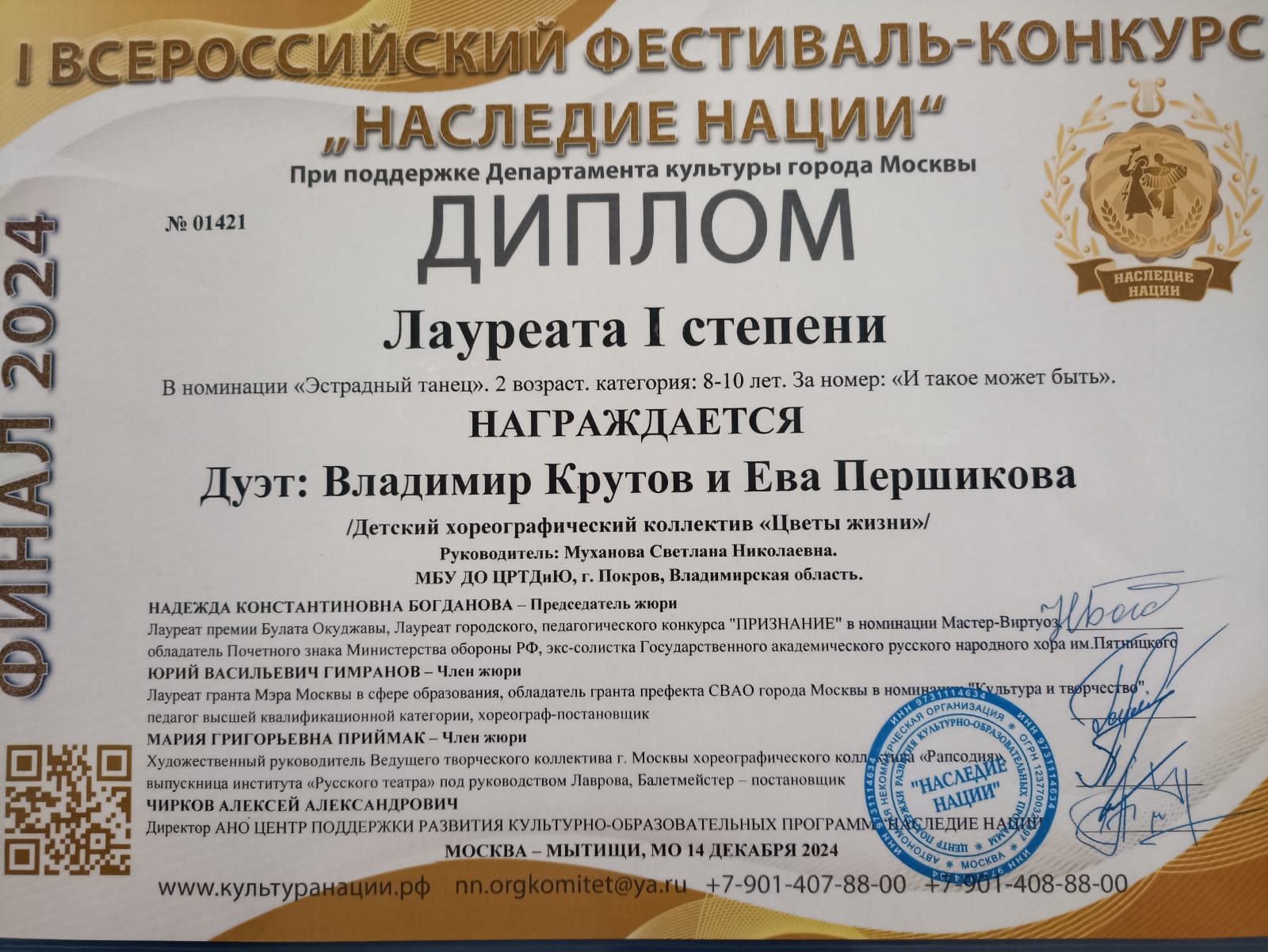 14 декабря солисты коллектива " Цветы жизни" Владимир Крутов и Ева Першикова ,приняли участие в г.Мытищи в ФИНАЛЕ Всероссийского конкурса " Наследие нации". В номинации Эстрадный танец пара исполнила танцевальную композицию " И такое может быть ...". По итогам конкурсной программы ученики Мухановой Светланы Николаевны завоевали Диплом Лауреата 1 степени.