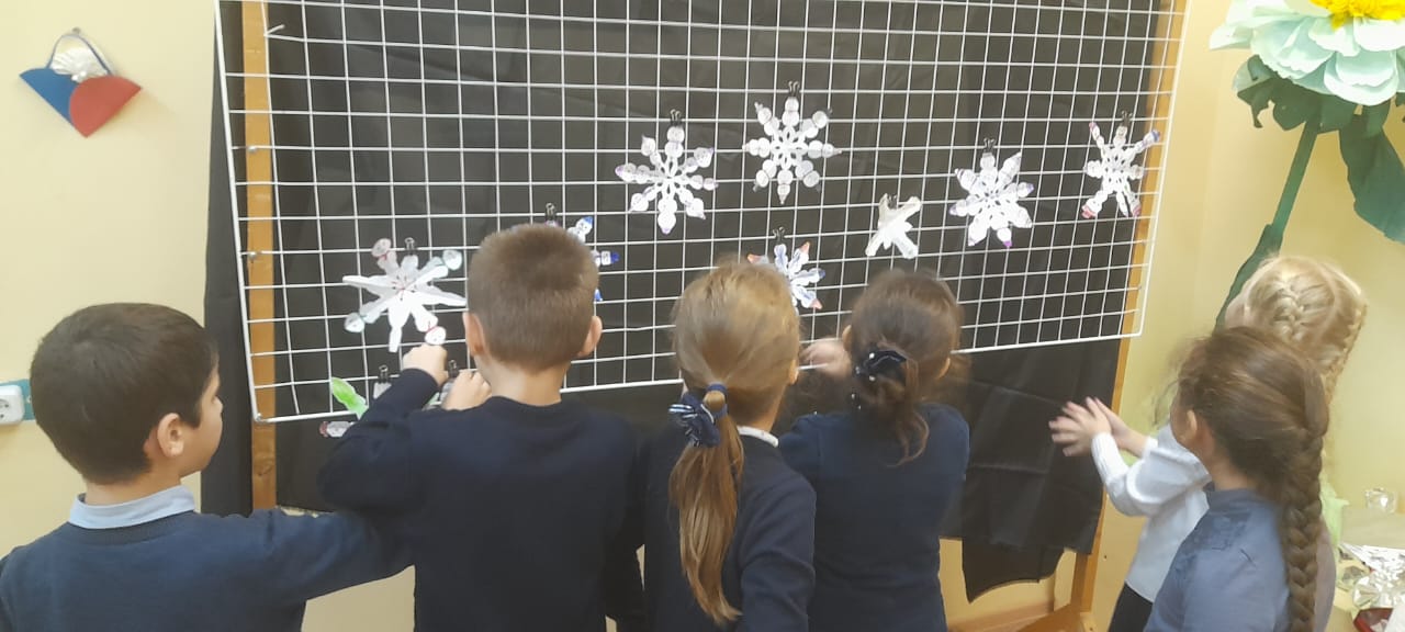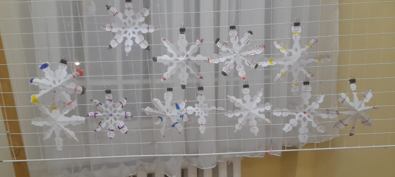 Дети второго года обучения смастерили снежинку со снеговиками. Поделка была сложная, ювелирная, требовала от детей аккуратности, точности, работы получились интересные. После создания, дети раскрасили снеговиков , приложив всю свою фантазию. А по традиции, в конце занятия, сделали импровизированную выставку. Примечательно, что не было ни одной одинаковой снежинки.