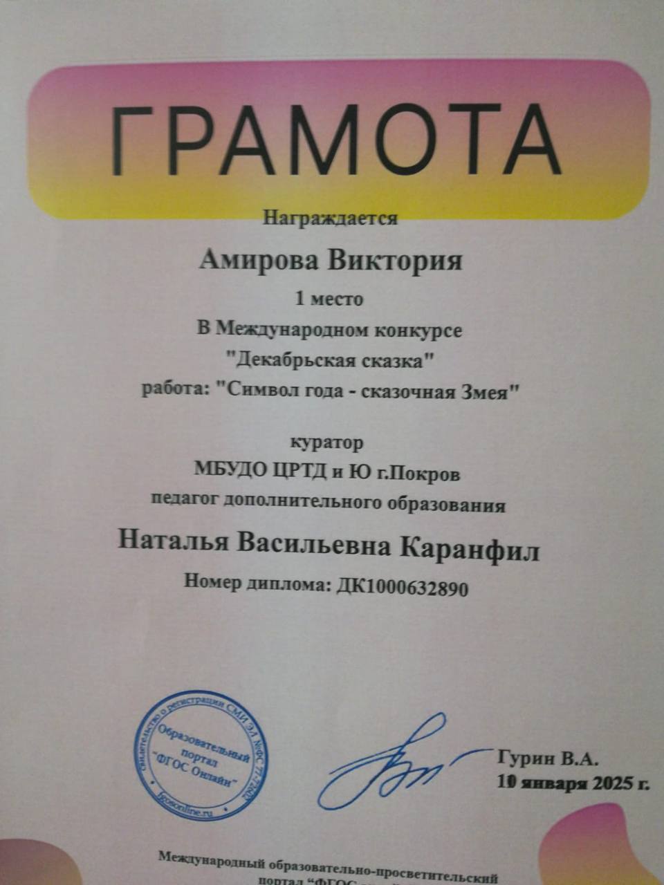 Поздравляем Викторию Амирову, обучающуюся студии "Бисероплетение" (руководитель Наталья Васильевна Каранфил) с I местом в Международном конкурсе "Декабрьская сказка". Работа Виктории "Символ года - сказочная Змея" была высоко оценена жюри!