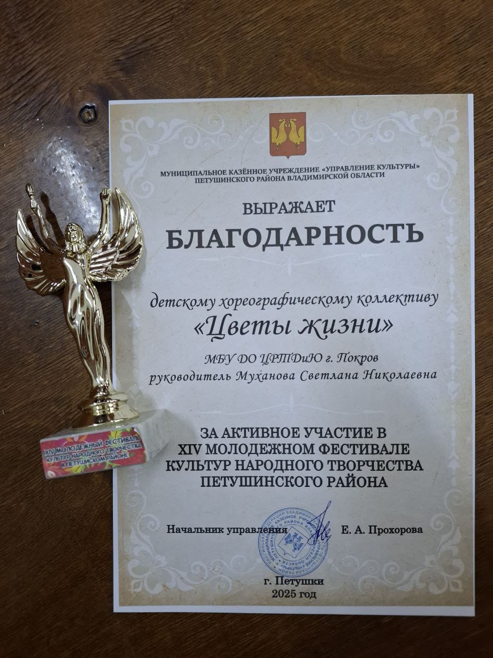 Участники Детского хореографического коллектива "Цветы жизни" (руководитель Светлана Николаевна Муханова) приняли активное участие в XIV Районном фестивале молодежных национальных культур ,который ежегодно проводится в ноябре Петушинском районе . В составе творческой делегации от города Покров, танцоры активно выступали вместе с участниками коллективов Городского Дома культуры нашего города . Театрализованная программа "Осенины" была показана в городах Костерево ,Петушки ,Покров ,а так же в пос. Вольгинский и Городищи