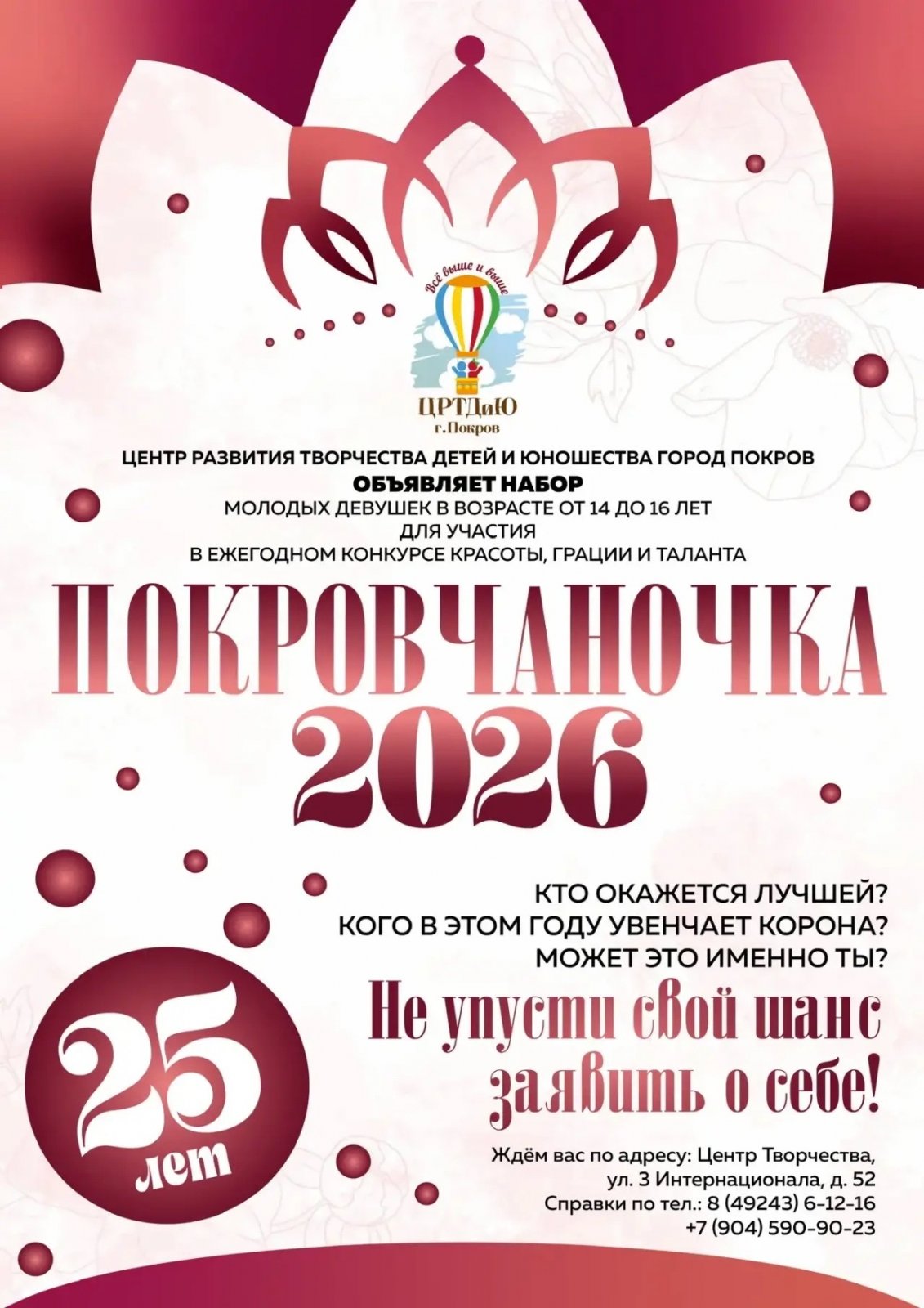 В 2026 году конкурс красоты, грации и таланта «Покровчаночка» отметит свой 25-летний юбилей! Мы гарантируем, что это событие станет по-настоящему незабываемым, еще более ярким и насыщенным. Вас ждет феерия красоты и талантов — мы обещаем сделать юбилейный год особенным!