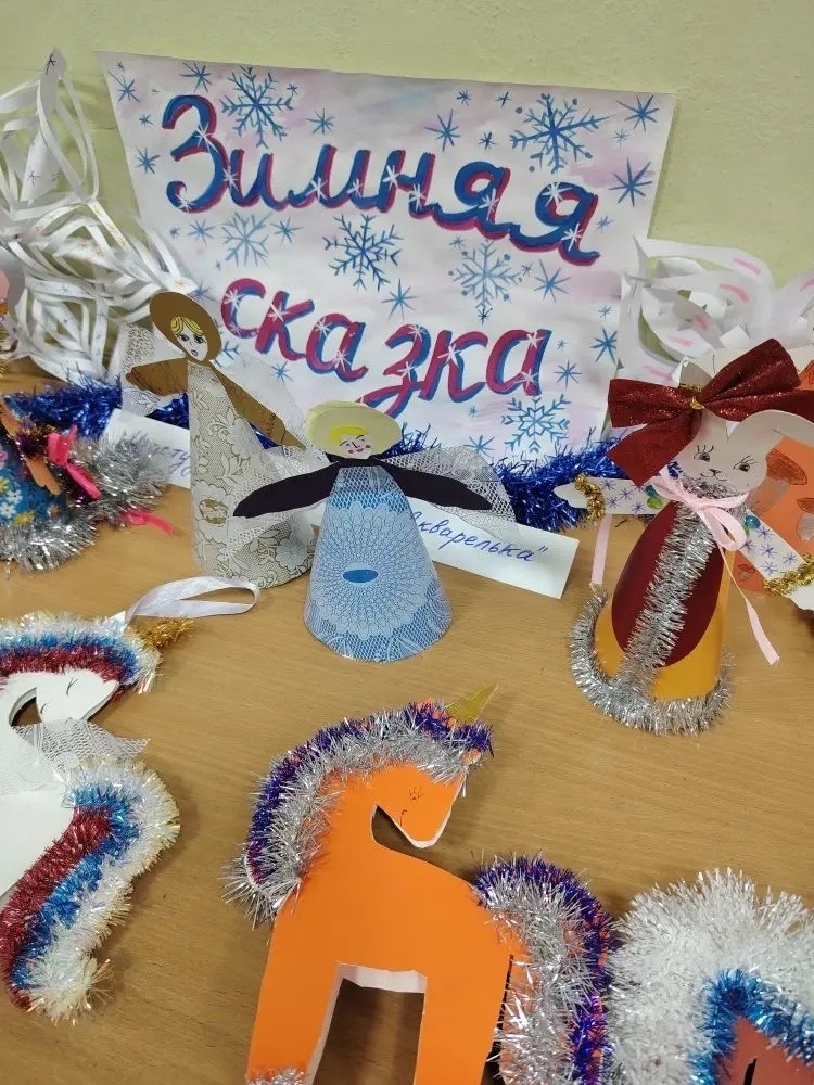 Дети делали из картона и мишуры ангелочка, Снегурочку, зайчика, мышку, единорога, снежинку.