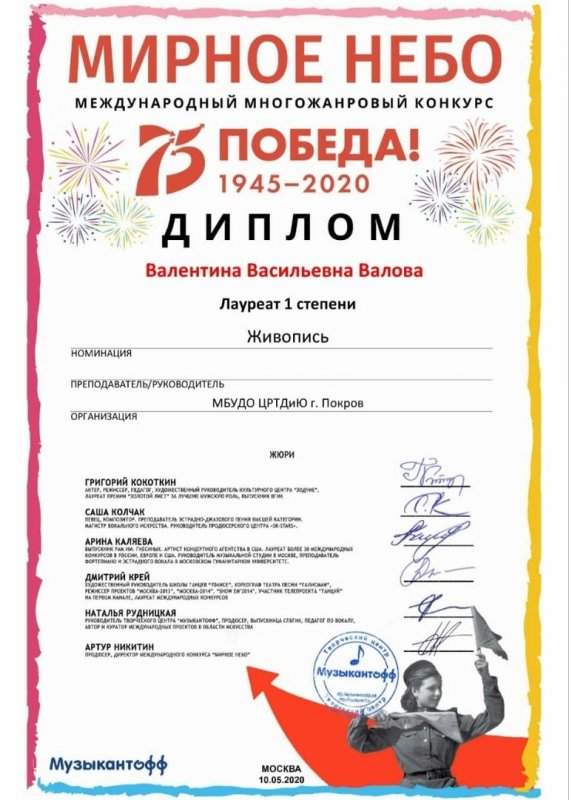 Руководитель изостудии "Радуга" Валова Валентина Васильевна принимала участие в Международном Многожанровом конкурсе "Мирное небо", посвящённом 75-летию Победы в Великой Отечественной войне. По результатам оценки жюри она завоевала диплом Лауреата 1 степени в номинации "Живопись".