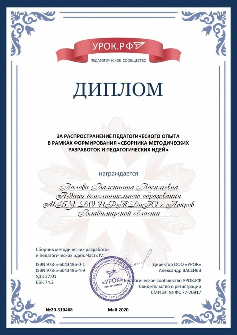 Руководитель изостудии "Радуга" Валова Валентина Васильевна принимала участие в вебинарах, организованных ГБПОУ г. Москвы "Воробьевы горы", РУДН, корпорацией "Российский учебник" и опубликовала статью в печатном издании "Сборник методических разработок и педагогических идей" педагогического сообщества "Урок. РФ"