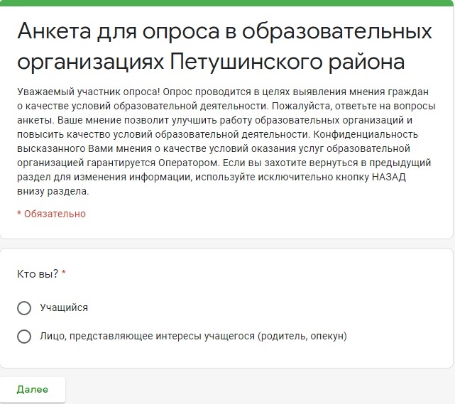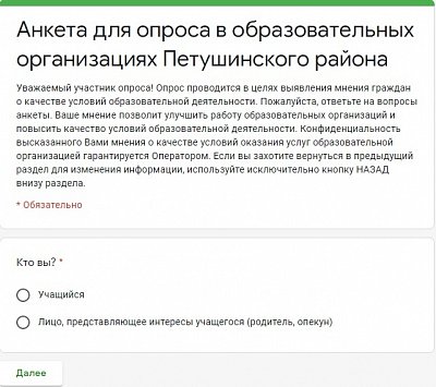 Уважаемые родители и обучающиеся Центра творчества! Большая просьба пройти важное для нас анкетирование. Опрос можно пройти по ссылке https://forms.gle/r4XUtSARCGcFmNn99, это займет у вас совсем немного времени. Спасибо за понимание.