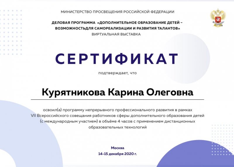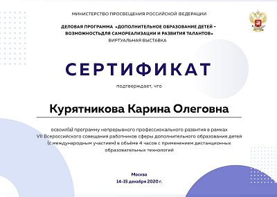14-15 декабря 2020 года состоялась VII Всероссийское совещание работников сферы дополнительного образования детей, в котором приняла участие наш директор - Курятникова Карина Олеговна