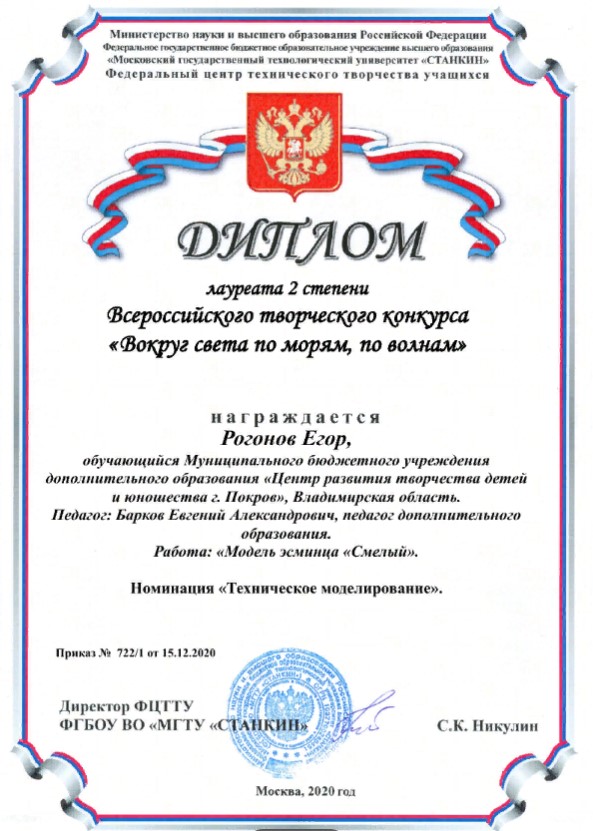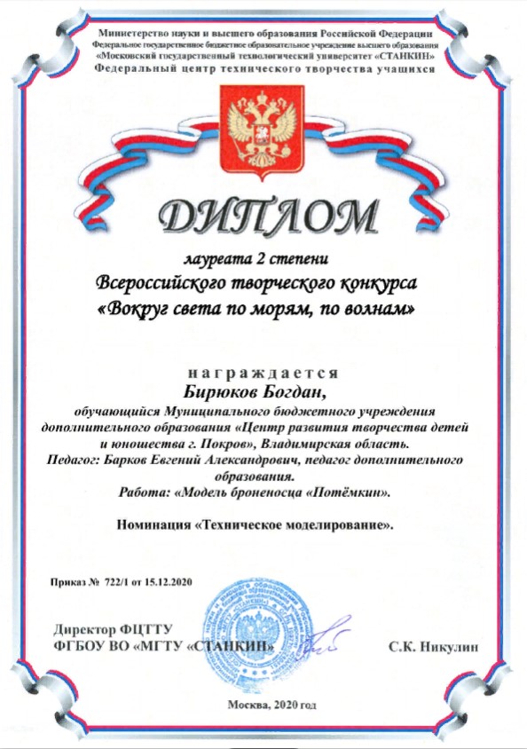 Стали известны результаты Всероссийского творческого конкурса "Вокруг света по морям, по волнам" и наша студия Судомоделирования под руководством Баркова Е.А. заняла почетные дипломы!