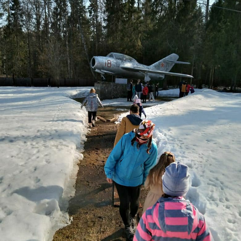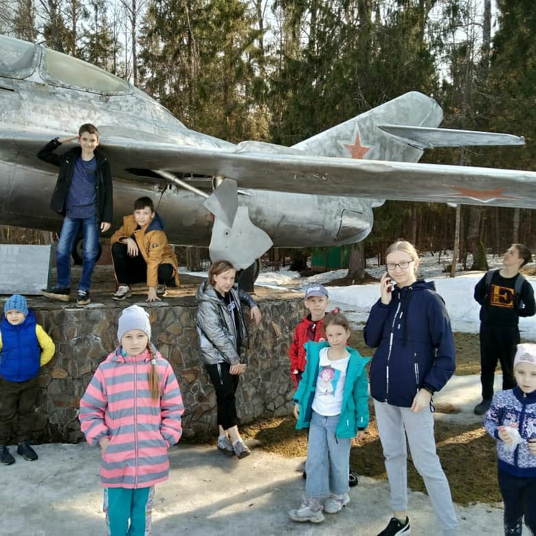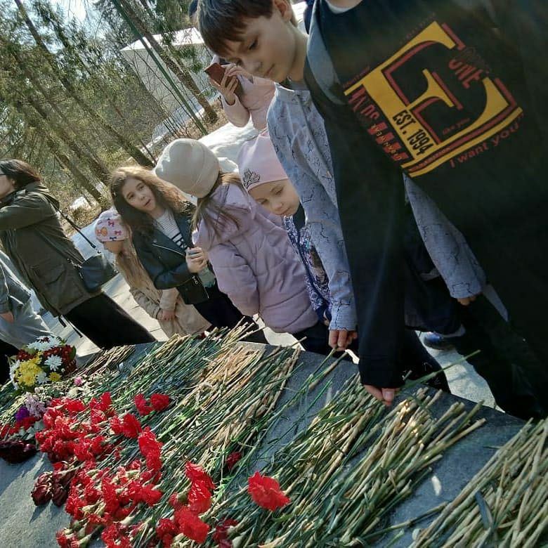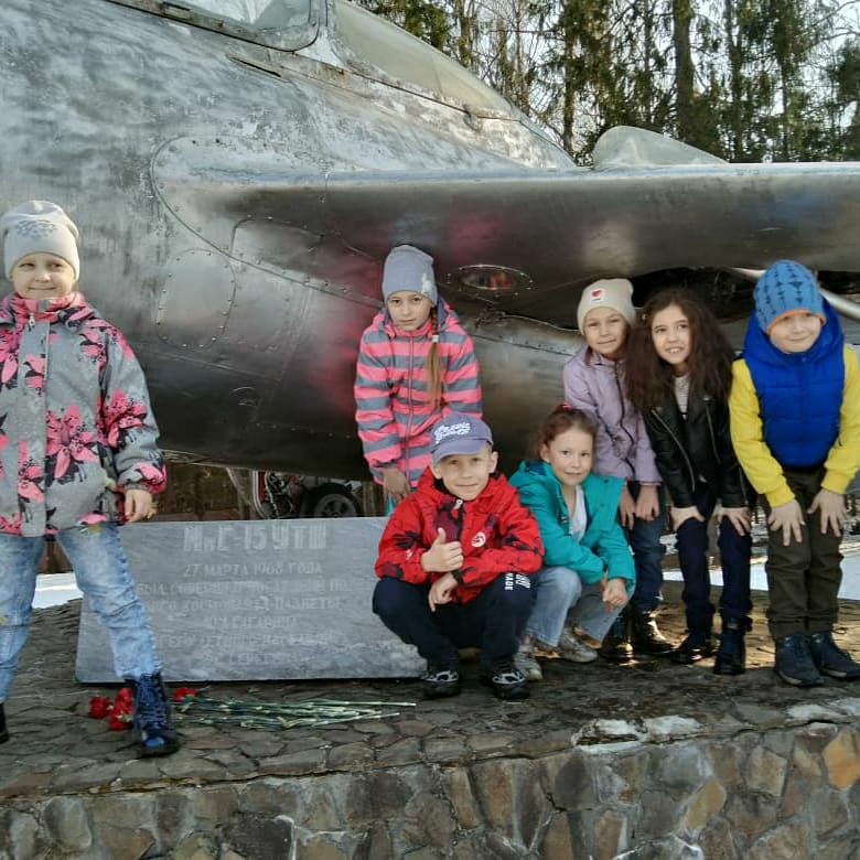 В память ребята возложили цветы и осмотрели место где стоит мемориал и копия самолета Миг
