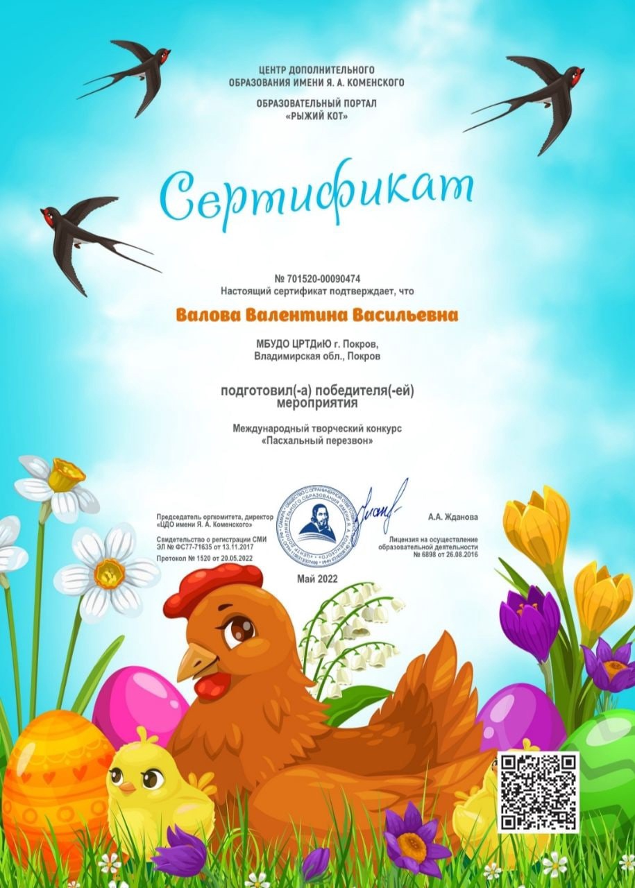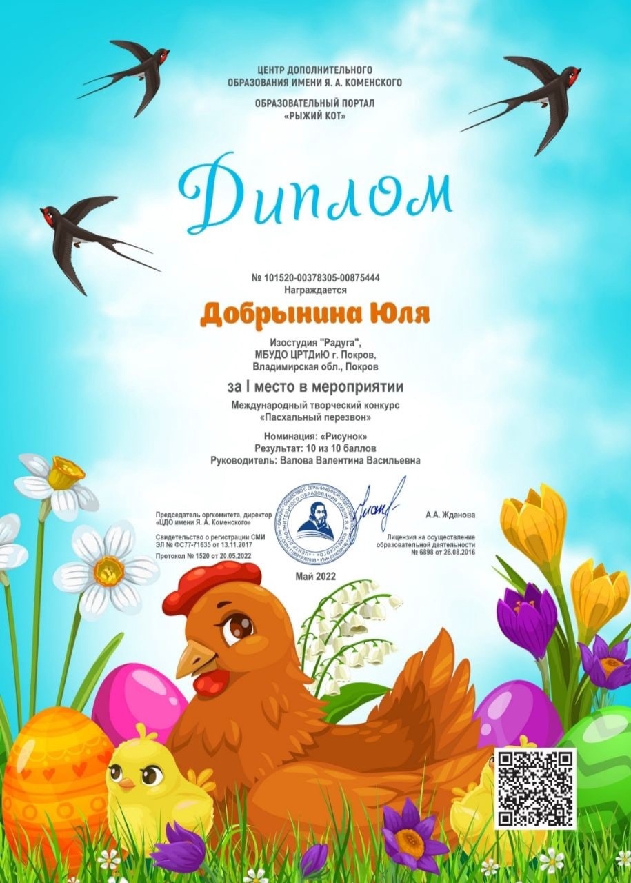 Поздравляем Добрынину Юлю , обучающуюся изостудии "Радуга" (руководитель Валова Валентина Васильевна) за победу в Международном творческом конкурсе "Пасхальный перезвон"