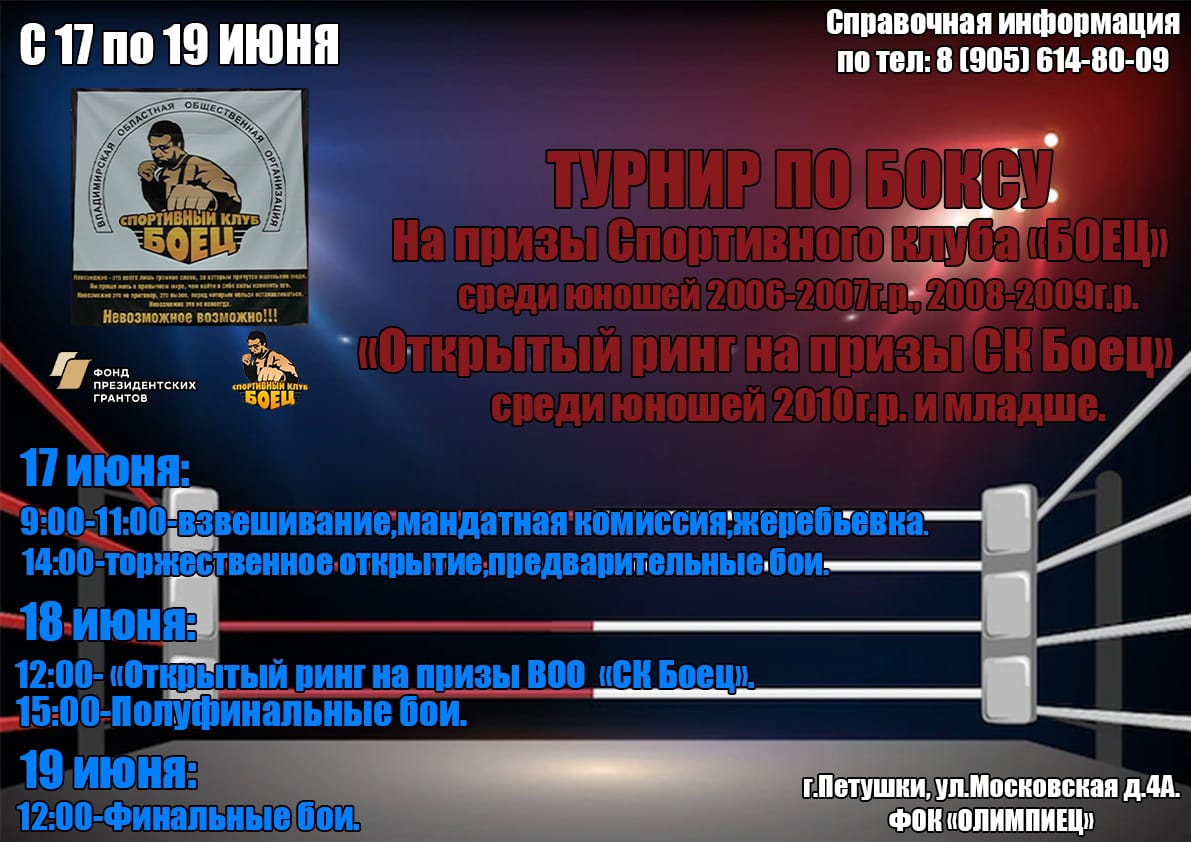 С 17 по 19 июня в ФОК "Олимпиец" города Петушки прошел турнир по боксу на призы спортивного клуба "Боец". Команда нашего тренера Олега Александровича Величко, вернулась с соревнований со следующими результатами: