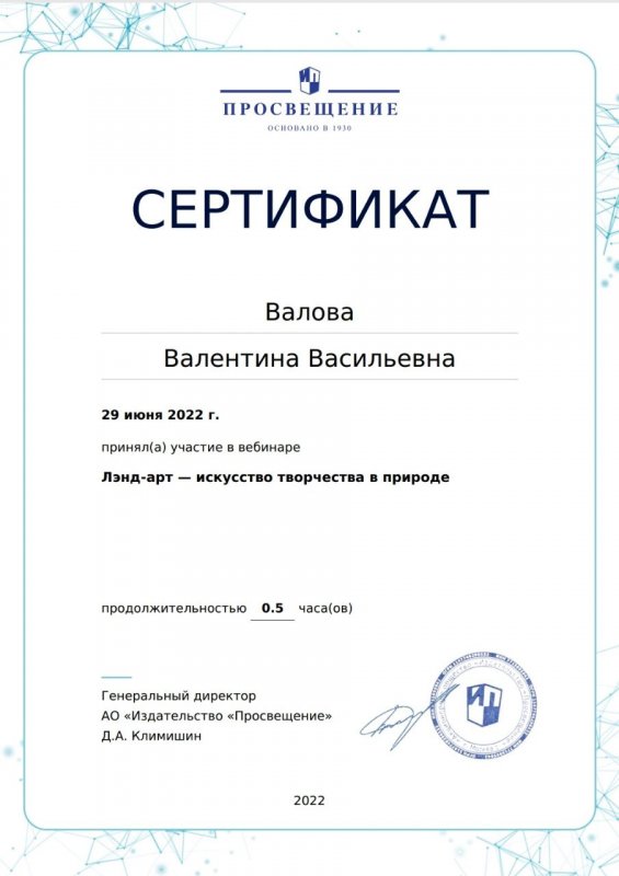 29 июня 2022 года руководитель изостудии "Радуга" Валова Валентина Васильевна принимала участие в вебинаре, организованном издательством Академия "Просвещение" г. Москва. Тема вебинара: "Лэнд-арт - искусство творчества в природе".