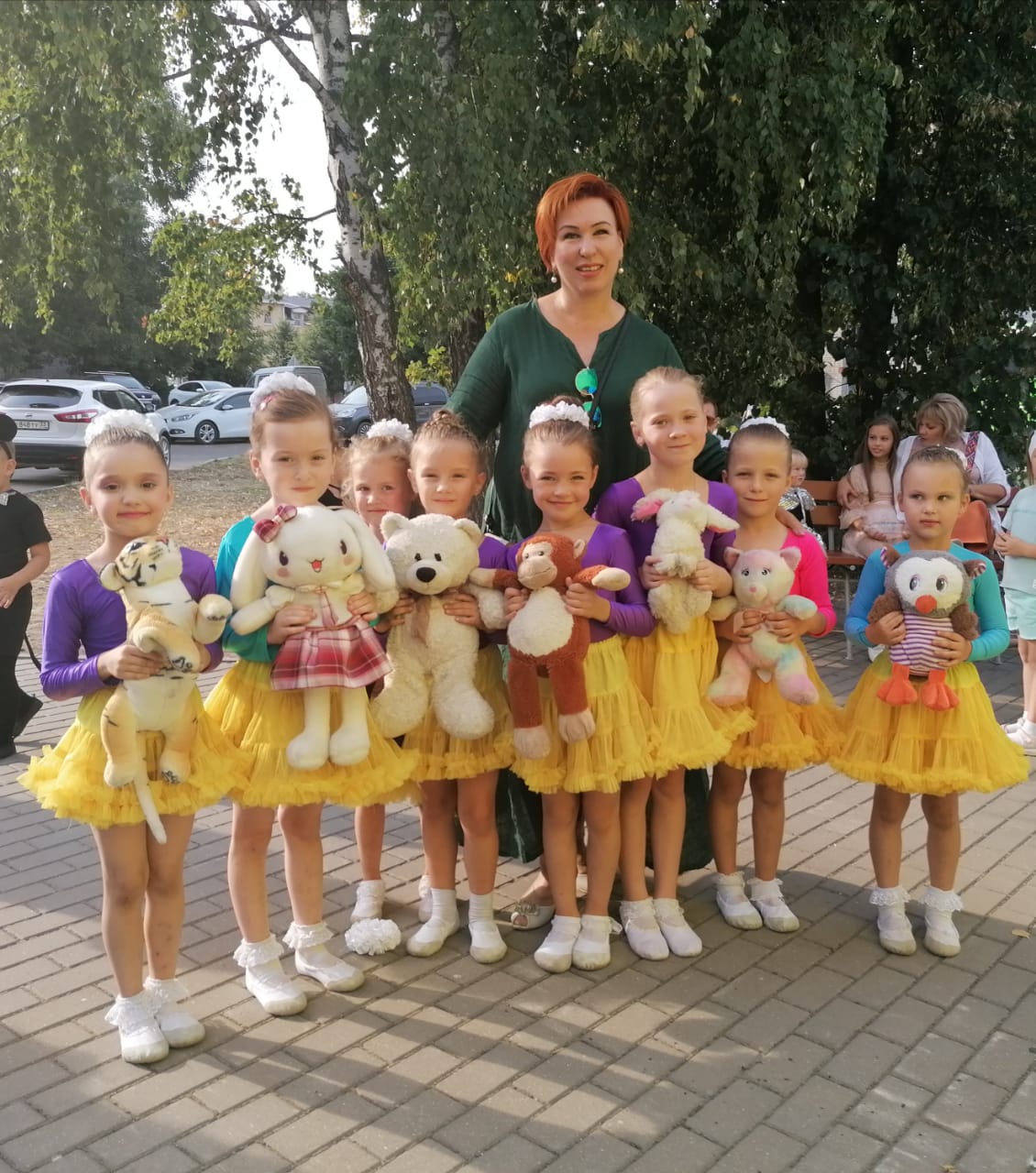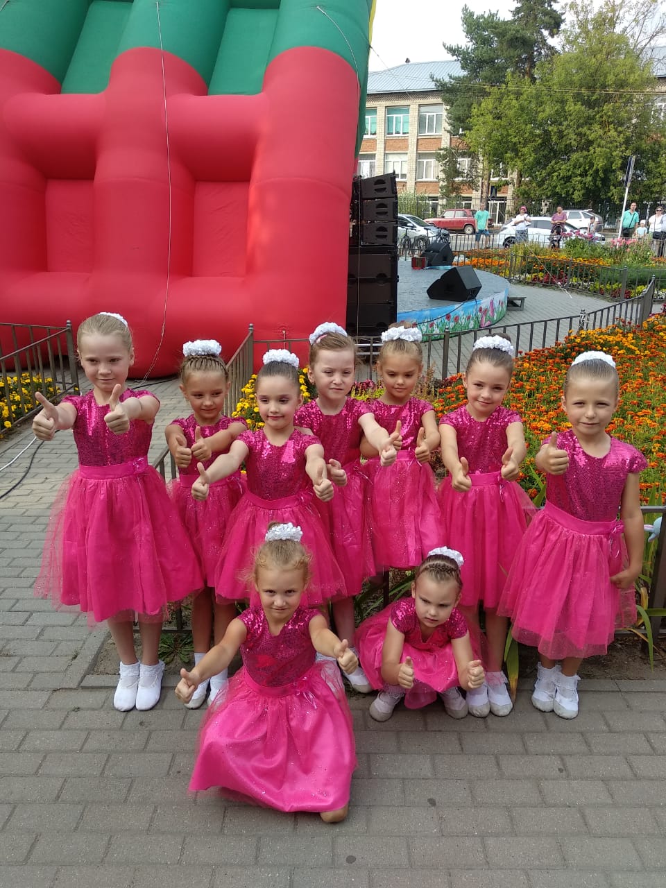 На круглой городской сцене дети 3 года обучения радовали зрителей исполнением двух танцев : " Цветочки " и " Мы с игрушкой не скучаем ". Волнение детей ,положительные эмоции ,улыбки родителей ,красота танца и костюма - всё это останется в памяти у юных танцоров как ощущение праздника.