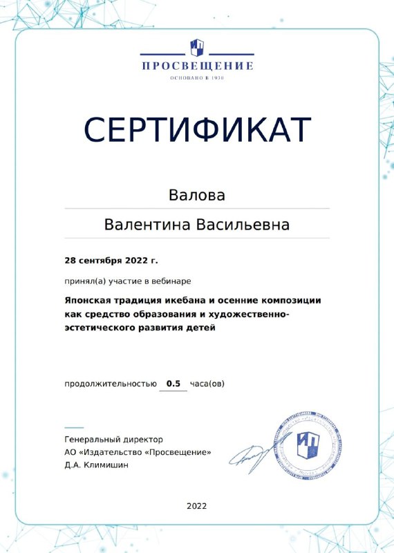 28 сентября 2022 года руководитель изостудии "Радуга"Валова Валентина Васильевна принимала участие в вебинаре, организованном издательством Академия "Просвещение" г. Москва. Тема вебинара: "Японская традиция икебана и осенние композиции, как средство образования и художественно-эстетического развития детей".