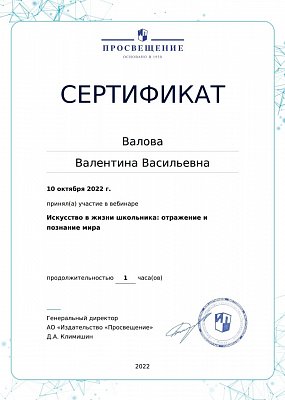10 октября 2022 года руководитель изостудии "Радуга" Валова Валентина Васильевна принимала участие в вебинаре, организованном издательством Академия "Просвещение" г. Москва. Тема вебинара: "Искусство в жизни школьника: отражение и познание мира".