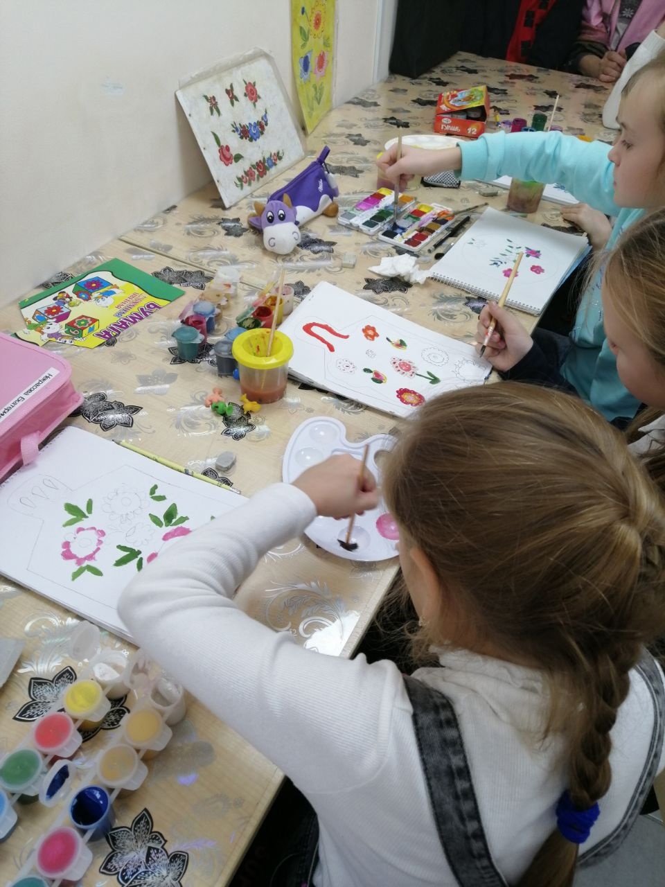 На занятии присутствовали 11 детей. Ребята познакомились с историей возникновения городецкого промысла, изучили элементы цветочного орнамента: "купавки" , "розаны", листья. Узнали, какие бывают виды композиции с элементами городецкой росписи,