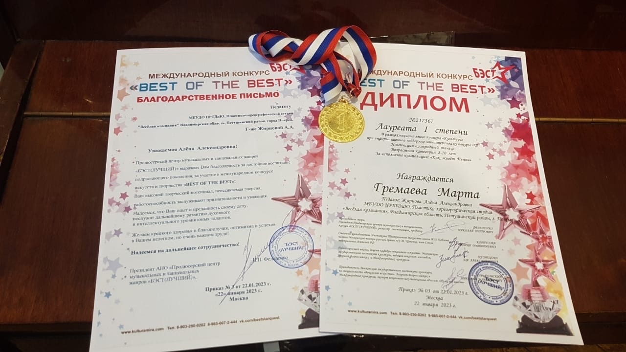 Поздравляем солистку ПХ студии "Весëлая компания" Гремаеву Марту с победой (лауреат 1 степени) на Международном конкурсе "Best of the Best" в г. Балашиха.