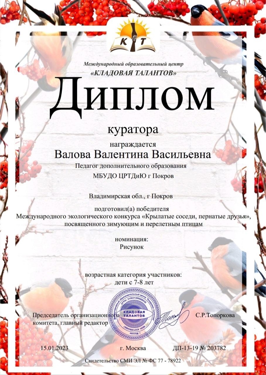 Поздравляем Добрынину Юлю, обучающуюся изостудии "Радуга" (руководитель Валова Валентина Васильевна) с победой в Международном экологическом конкурсе "Крылатые соседи, пернатые друзья" , посвященного зимующим и перелетным птицам.