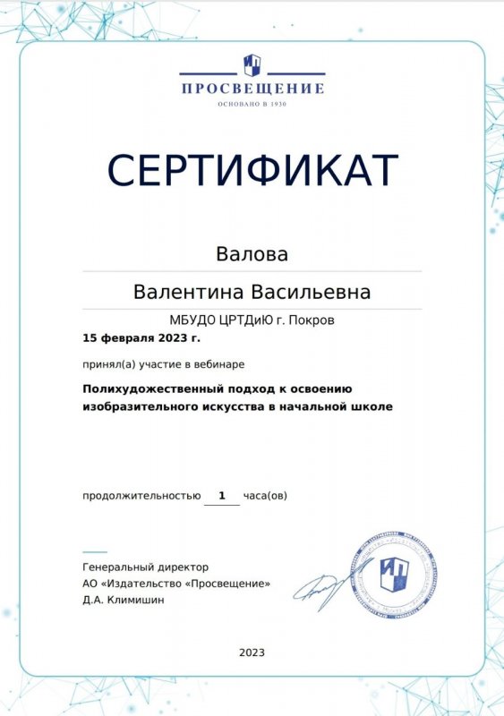 Руководитель изостудии "Радуга" Валова Валентина Васильевна принимала участие в вебинаре, организованном издательством Академия "Просвещение" г. Москва. Тема вебинара: "Полихудожественный подход к освоению изобразительного искусства в начальной школе".