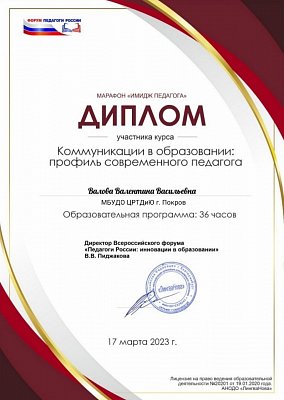 В рамках марафона Валентина Васильевна освоила курс повышения квалификации "Коммуникации в образовании: профиль современного педагога" 36 часов.