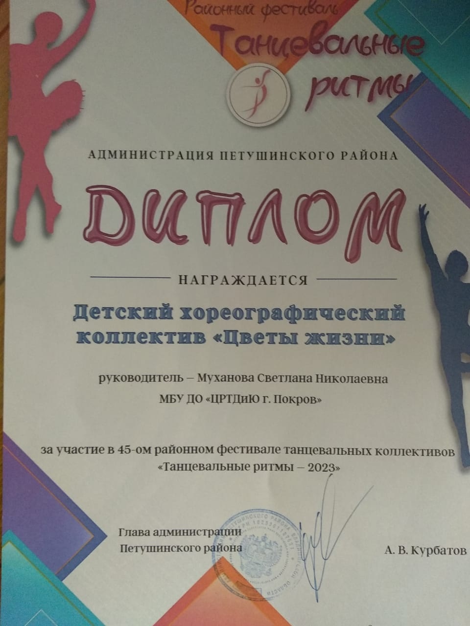 8 апреля Детский хореографический коллектив " Цветы жизни" принял участие в традиционном районном мероприятии : Фестивале хореографического искусства " Танцевальные ритмы 2023 ". Младший и старший состав коллектива исполнили два танца :
