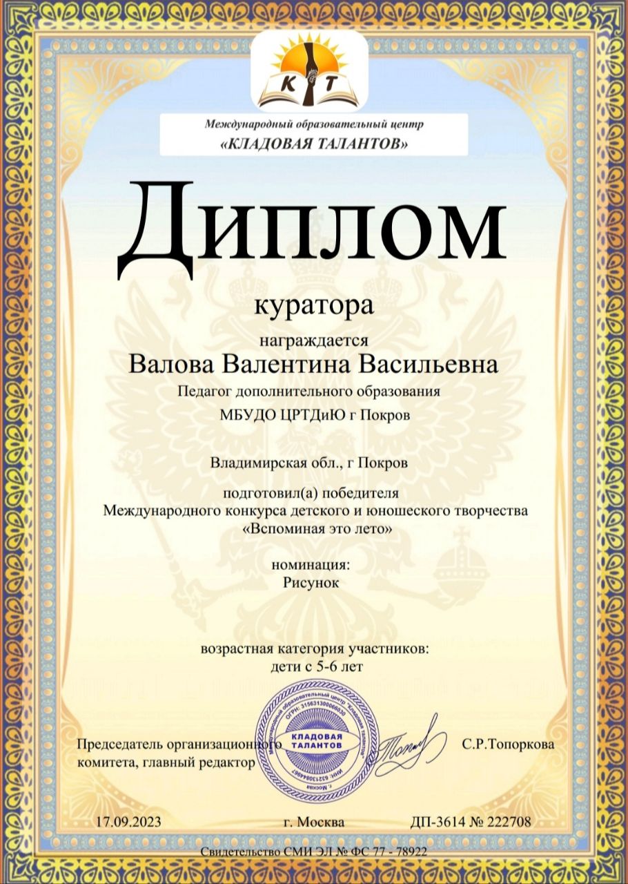 Поздравляем Кулешову Веронику, обучающуюся изостудии "Акварелька" (руководитель Валова Валентина Васильевна) с победой в Международном конкурсе детского и юношеского творчества "Вспоминая это лето".