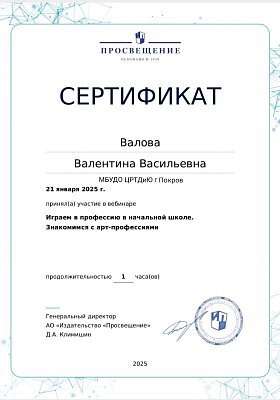 21 января 2025 года руководитель изостудии "Радуга" Валова Валентина Васильевна принимала участие в вебинаре, организованном издательством Академия "Просвещение" г. Москва. Тема вебинара: "Играем в профессию в начальной школе. Знакомимся с арт-профессиями".