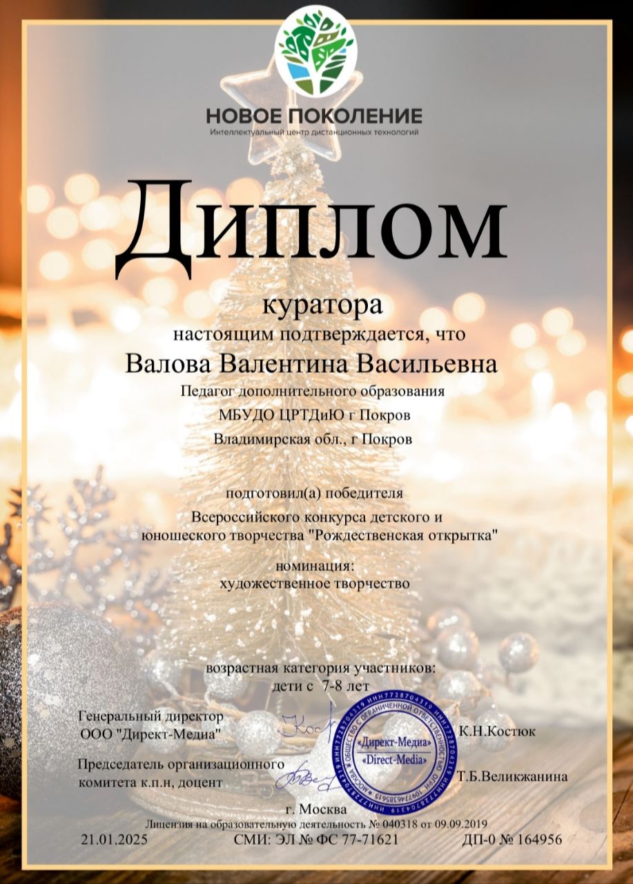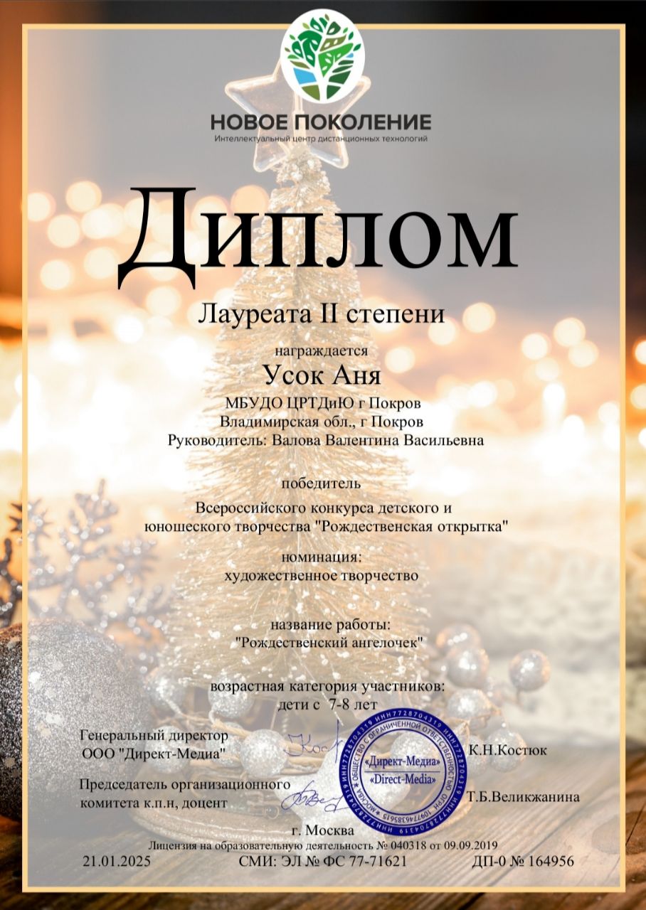 Поздравляем Усок Аню, обучающуюся изостудии "Радуга" (руководитель Валова Валентина Васильевна) с победой во Всероссийском конкурсе детского и юношеского творчества "Рождественская открытка".