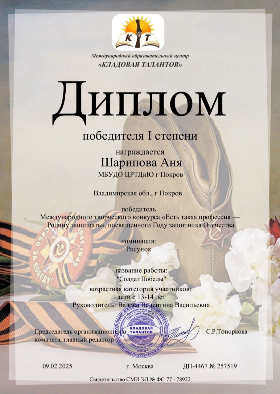 Поздравляем Шарипову Аню, обучающуюся изостудии "Радуга"(руководитель Валова Валентина Васильевна) с победой в Международном творческом конкурсе "Есть такая профессия - Родину защищать", посвящённом Году защитника Отечества.