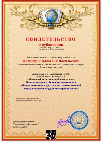 Педагог дополнительного образования Каранфил Наталья Васильевна опубликовала в образовательном СМИ «Педагогический альманах» собственный педагогический опыт на тему: Дополнительная общеобразовательная общеразвивающая программа художественной направленности студии «Бисероплетение». Ознакомиться с материалом можно по ссылке постоянного адреса публикации: https://www.pedalmanac.ru/458214