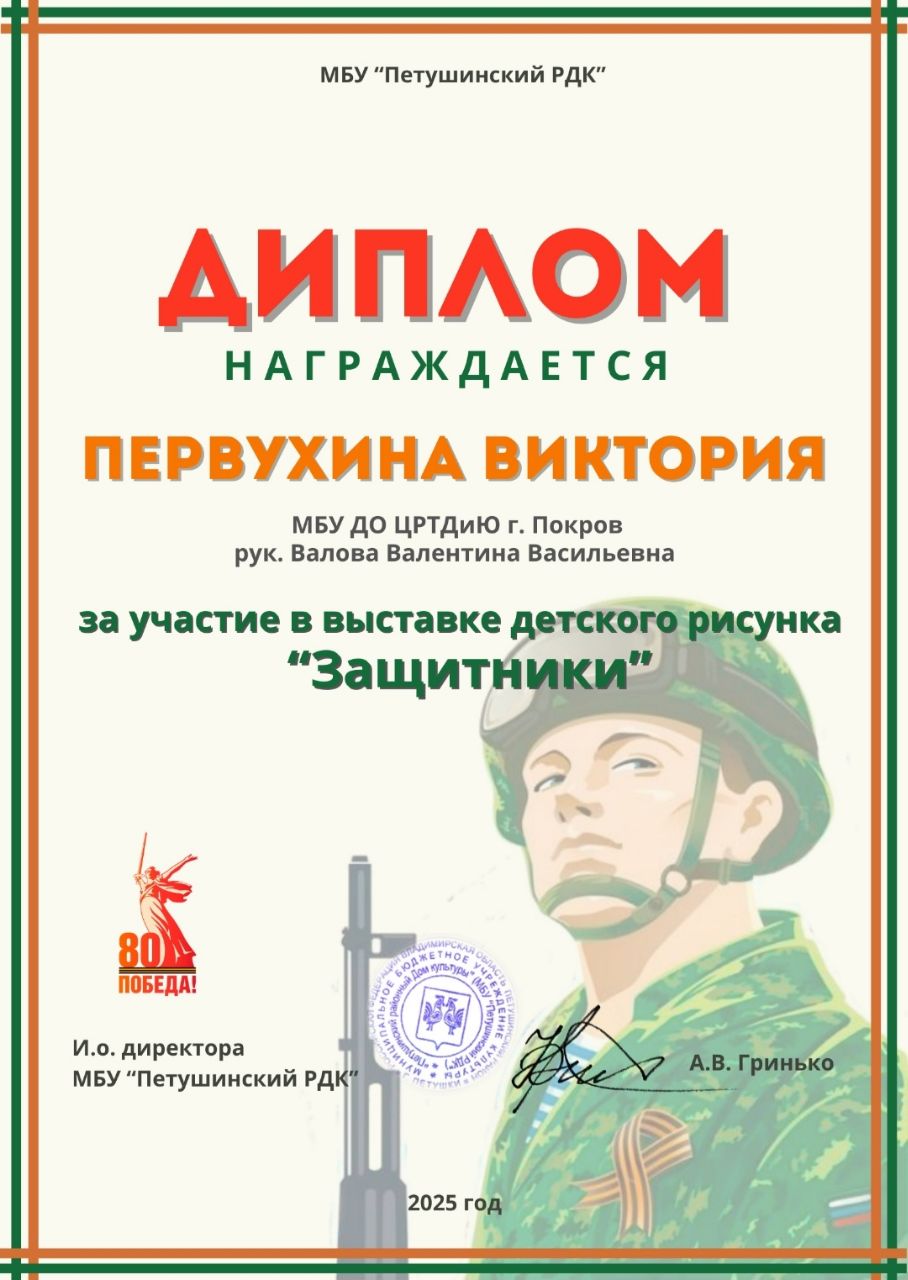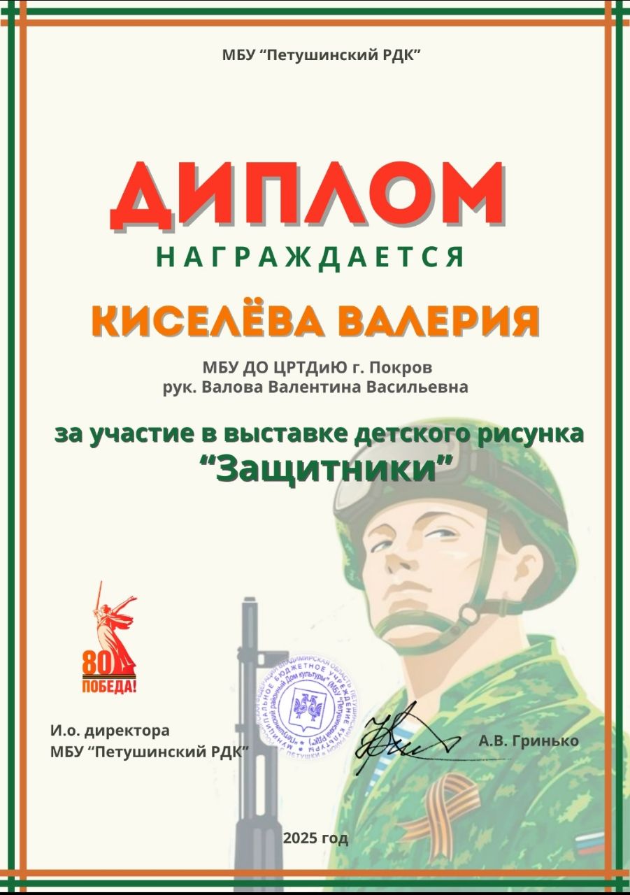 Поздравляем Первухину Вику и Киселеву Леру - учащихся изостудии "Радуга" (руководитель Валова Валентина Васильевна), награжденных дипломами за участие в районной выставке детского рисунка "Защитники".