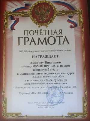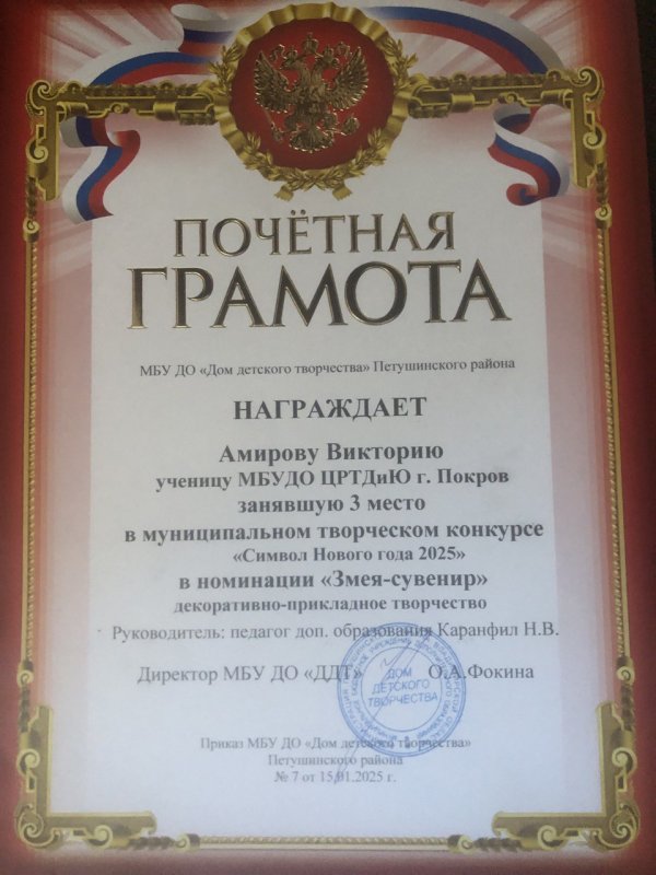 Поздравляем Викторию Амирову , занявшую III место в муниципальном творческом конкурсе «Символ Нового года 2025», в номинации «Змея -сувенир». Вика давно и успешно занимается в студия «Бисероплетение» руководитель Наталья Васильевна Каранфил .