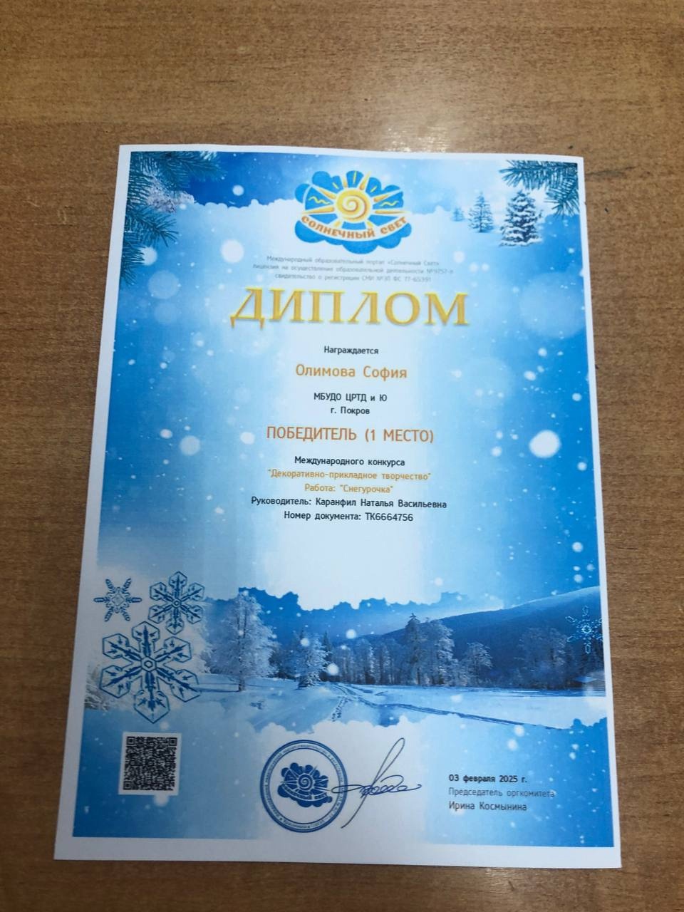 Поздравляем Софию Олимову с победой в Международном конкурсе «Декоративно-прикладное творчество» . Ее работа «Снегурочка» заняла I место! София ученица студии «Бисероплетение», руководитель Наталья Васильевна Каранфил