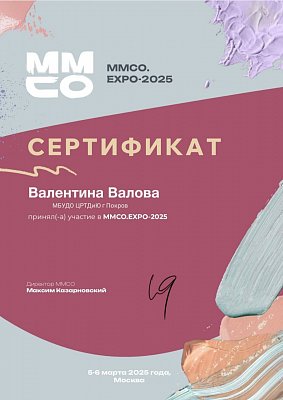 В марте 2025 года руководитель изостудии "Радуга" Валова Валентина Васильевна принимала участие в форуме "Образование для экономики будущего" в рамках MMCO. EXPO - 2025 г. Москва. Форум проходил на площадке ЦВК "Экспоцентр" и онлайн на платформе "ММСО. Коннект".