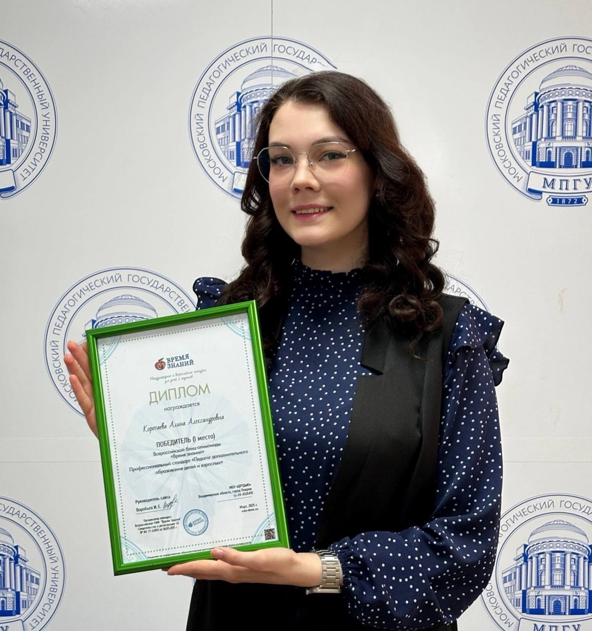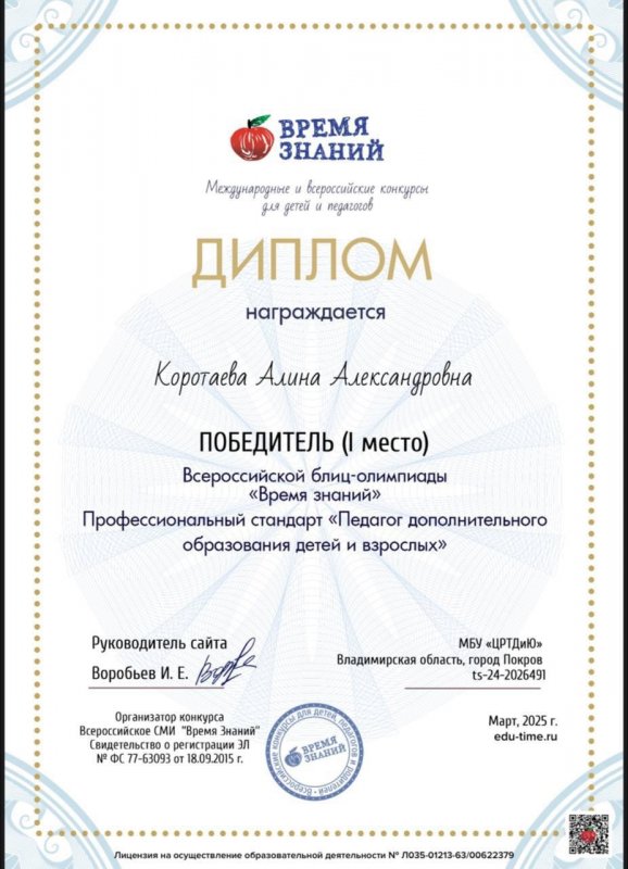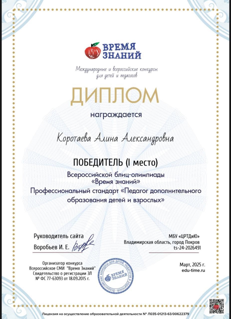 Педагог студии «Английский язык» Центра развития творчества детей и юношества г. Покров, Алина Александровна Коротаева, приняла участие во Всероссийской блиц-олимпиаде «Время знаний».