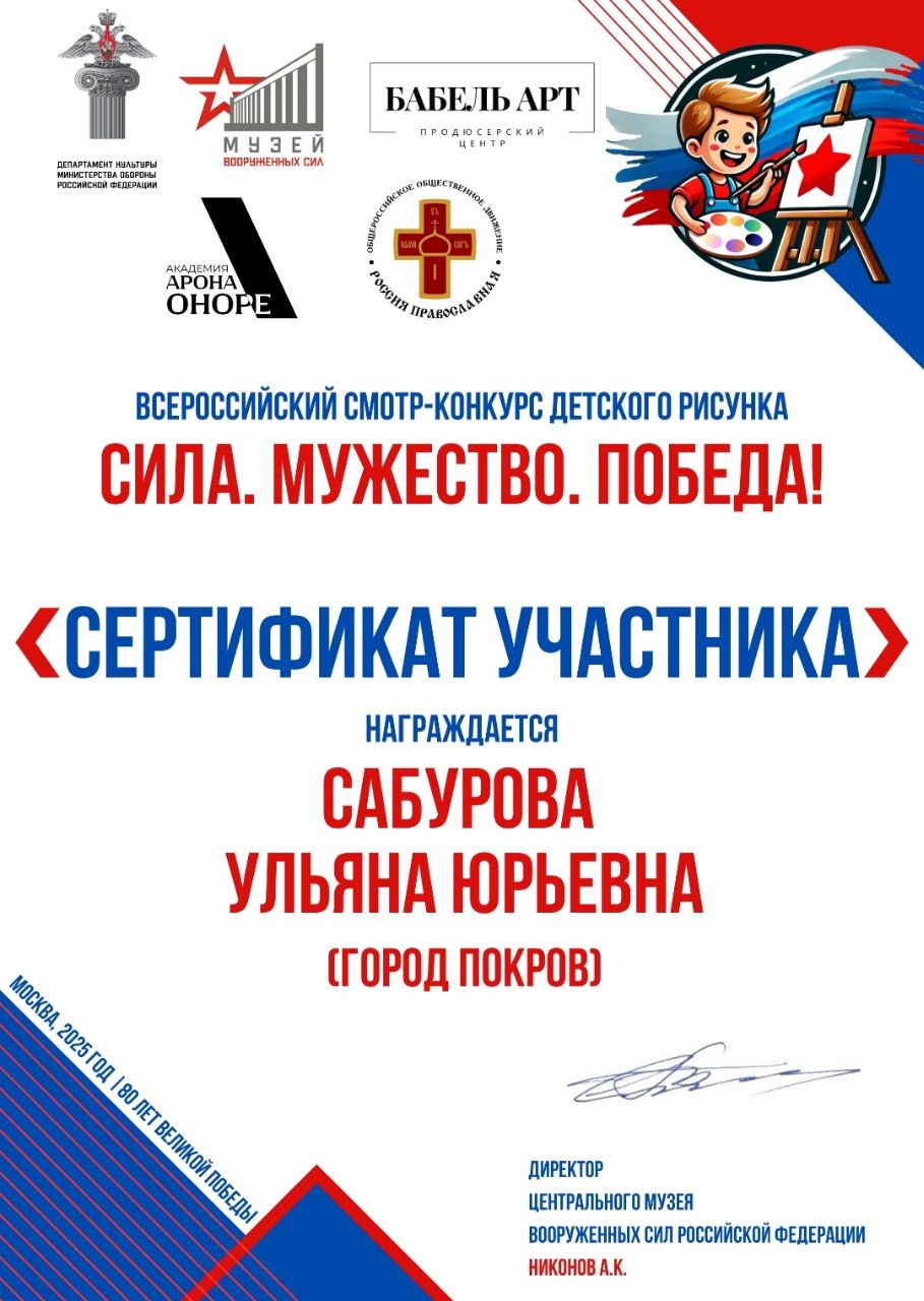 Поздравляем Сабурову Ульяну - учащуюся изостудии "Радуга" (руководитель Валова Валентина Васильевна), награжденную сертификатом за участие во Всероссийском осмотре-конкурсе детского рисунка "СИЛА. МУЖЕСТВО. ПОБЕДА!", посвящённого 80-летию Победы в Великой Отечественной войне.
